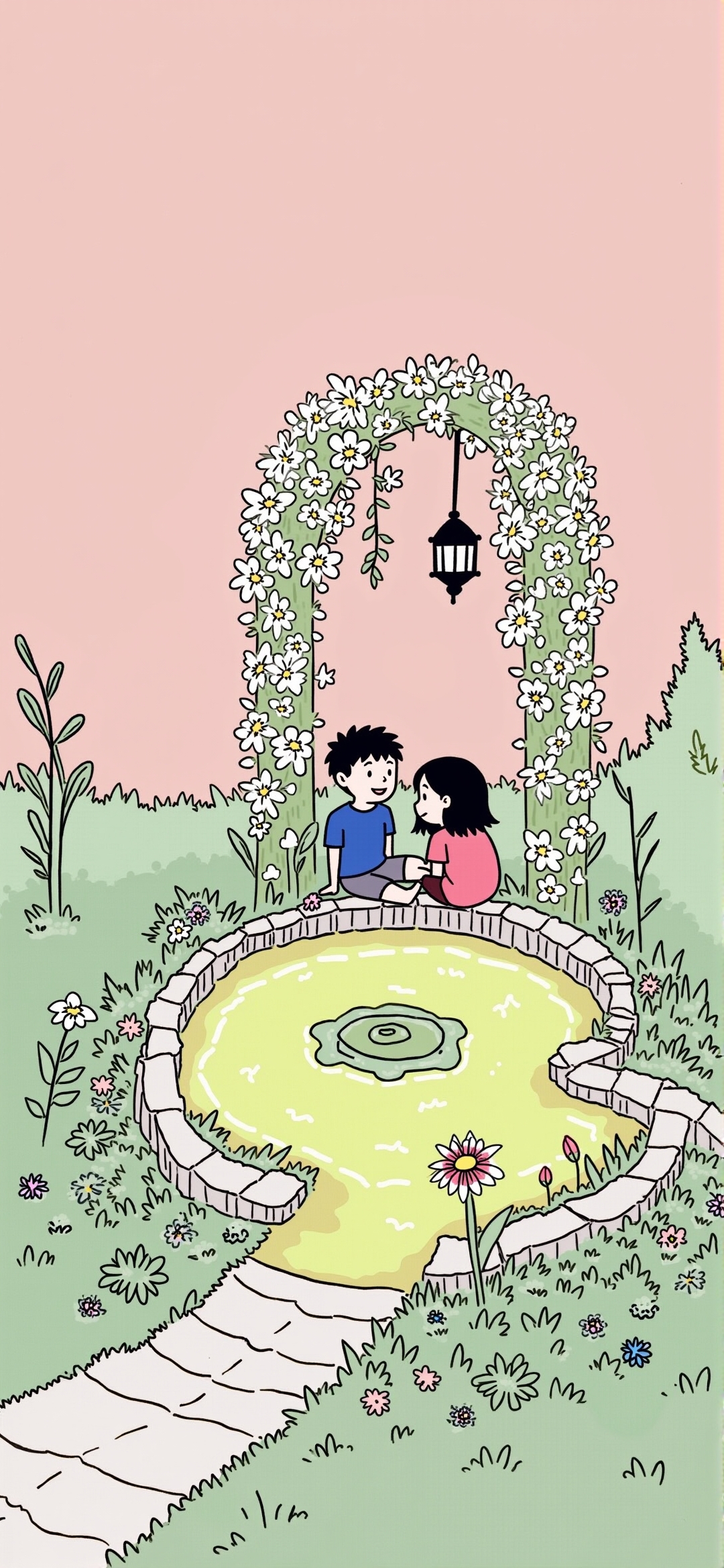 渲染的异想天开的花园景象。这幅插图描绘了一个小男孩和一个小女孩坐在圆形石头池塘的边缘,在一个鲜花覆盖的拱门下面。孩子们穿着简单的衣服,男孩穿蓝色,女孩穿粉红色,他们快乐的表情暗示着一种有趣的互动。池塘是一片生机勃勃的黄绿色,中间有一片睡莲,周围的草地是一片亮绿色,点缀着五颜六色的花朵。一条鹅卵石小径从池塘通向观赏者。背景以柔和的粉色天空为特色,营造出一种温暖而诱人的氛围。插图的整体风格是卡通和轻松,强调童年的天真和快乐。