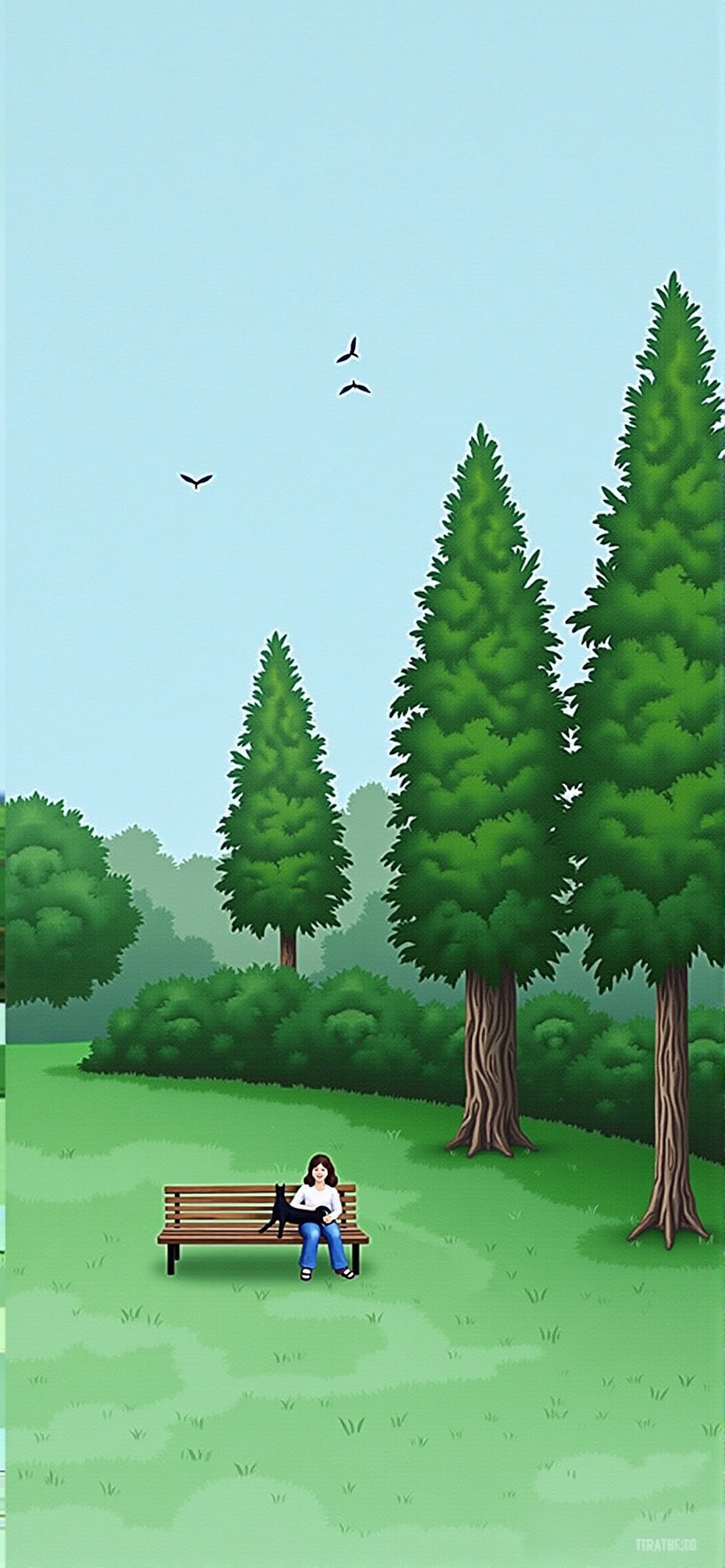 宁静公园景色插画:长发女子与黑猫树下憩息