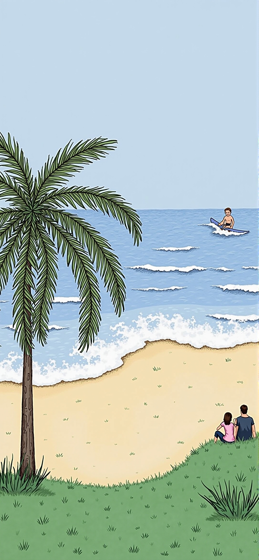 热带海滩景色的渲染图像。该图像以卡通风格完成,具有简化的调色板和平面透视图。一棵大棕榈树占据了框架的左侧,它的叶子部分遮挡了海洋的视野。温柔的海浪拍打着沙滩。远处,一个棕色头发的年轻人在冲浪板上划桨。从一个长满草的有利位置,一男一女并排坐着,凝视着冲浪者。整体构图唤起一种宁静的休闲和暑假的感觉。