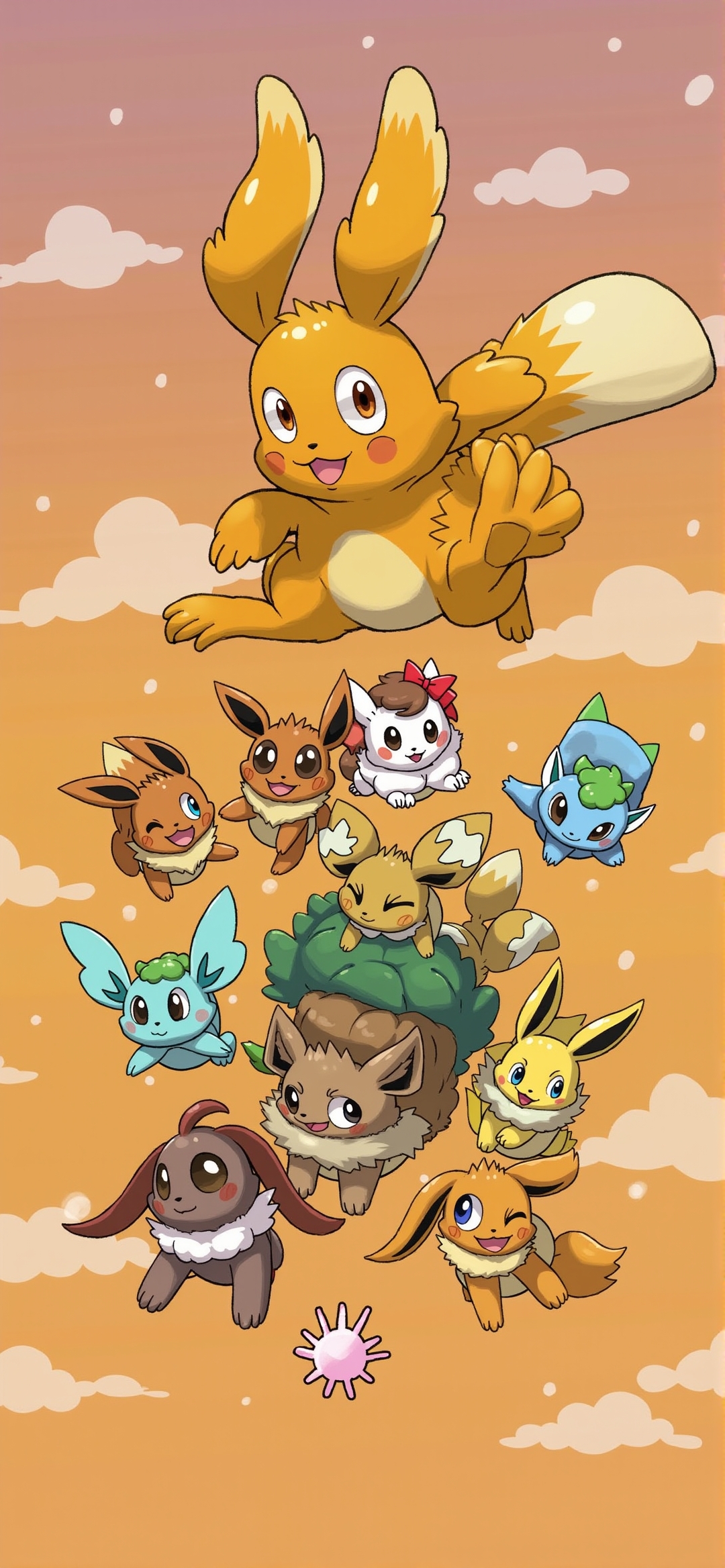 这是一个渲染的图像,十个流行的poksammon角色在桃子色的天空中翱翔,天空中有蓬松的白云。一只大的、金黄色的、脸颊呈玫瑰色的Flareon占据了画面的顶部,而一只绿棕色的Grotle背上背着另外两只波克萨蒙。总的来说,这幅图展示了九个不同种类的波克萨蒙:Flareon、Grotle、Eevee、Vaporeon、Sylveon、Jolteon、Umbreon、Espeon和mincino。该图像具有欢快,异想天开的色调,并以丰富多彩的卡通风格呈现。