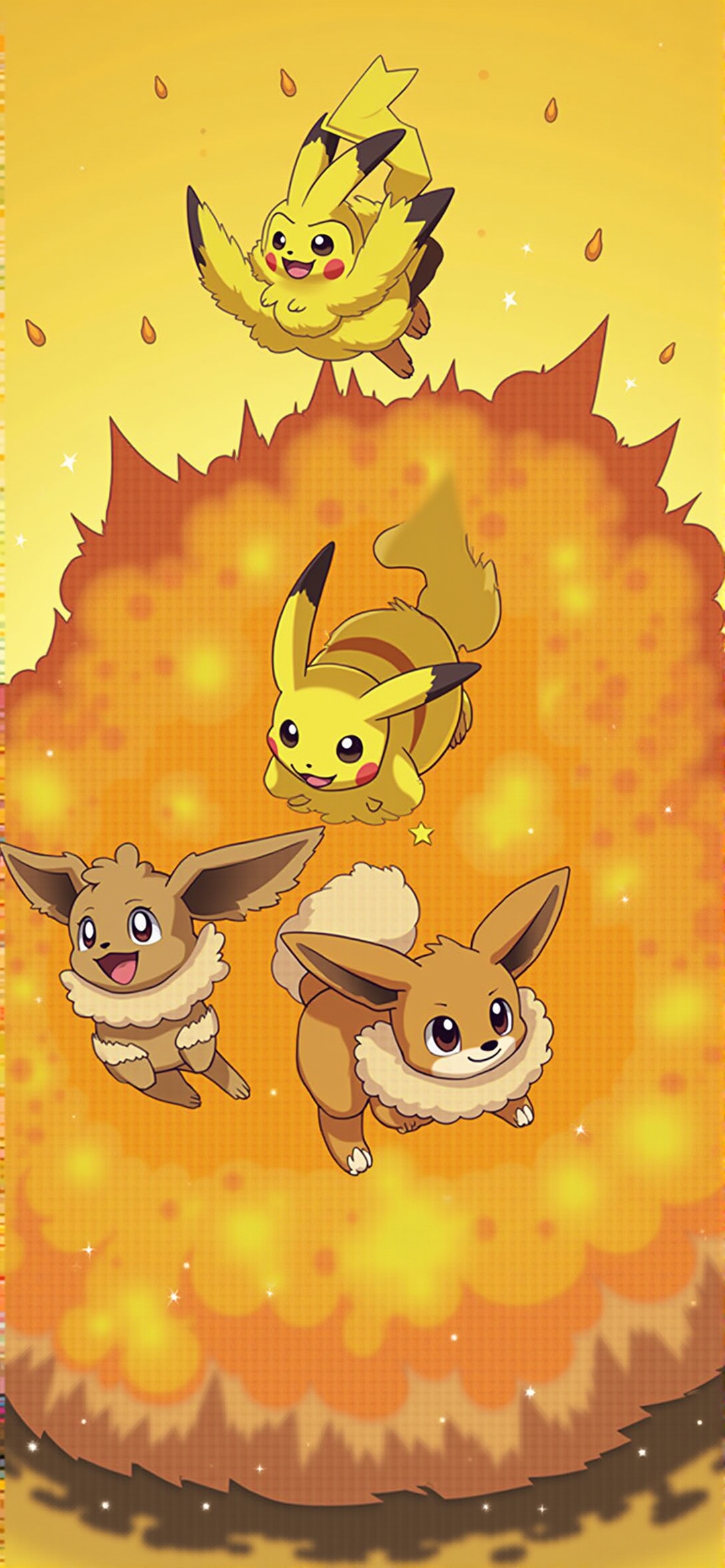 活力四射的宝可梦艺术图:飞行动态皮卡丘与爆炸效果伊布