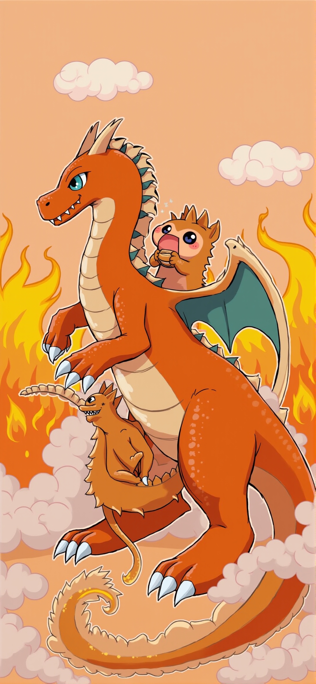 渲染图像的三个卡通龙对一个橙色的背景。最大的一条长着绿色翅膀的亮橙色巨龙占据了整个画面。它高高站立,面朝左边,背上栖息着一条较小的橙色龙。这条体型较小的龙,有着大大的眼睛和高兴的表情,正在享受着点心。第三条橙色的龙,位于另外两条龙的下方,带着滑稽的表情向上凝视着。这三条龙都有夸张的卡通比例,黑色轮廓的风格也很相似。背景以风格化的火焰和云彩为特征,为梦幻主题做出了贡献。该图像使用了温暖,充满活力的调色板。