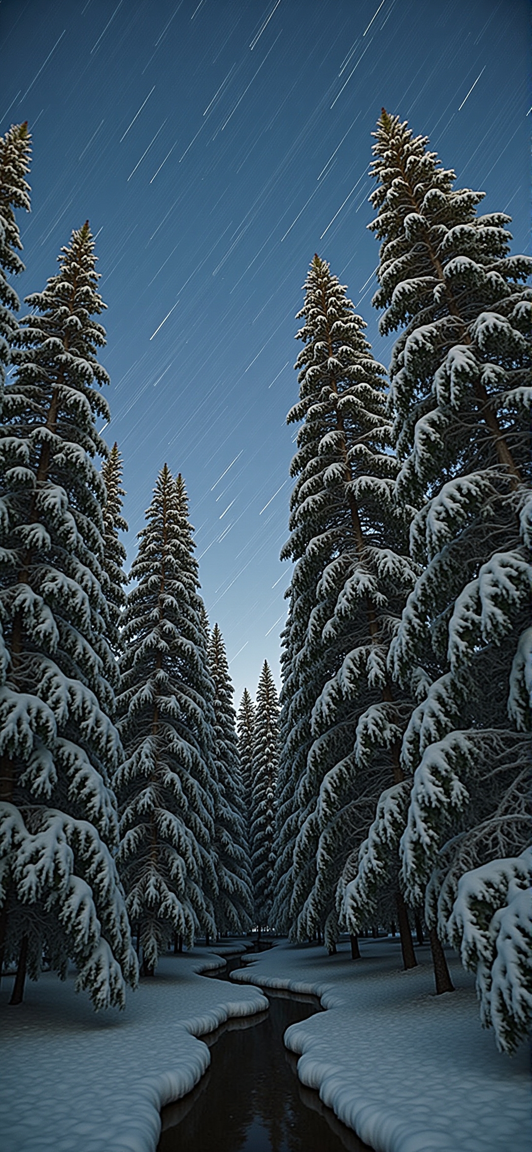 夜幕下雪覆盖松林星轨绵延的宁静冬日摄影