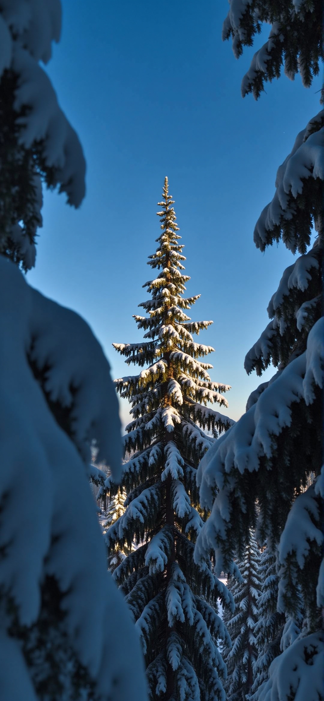 照片中,一棵被白雪覆盖的常青树映衬着生机勃勃的蓝天。这张照片是从一个低角度拍摄的,仰望着画面中心的那棵树。树枝被雪压垮了,给人一种宁静的感觉。阳光在雪地上投下长长的阴影,增加了图像的深度和质感。这张照片的整体色调是凉爽而宁静的,捕捉到了冬季风景的美丽。通过周围被雪覆盖的树枝拍摄的镜头进一步强调了场景的宁静。