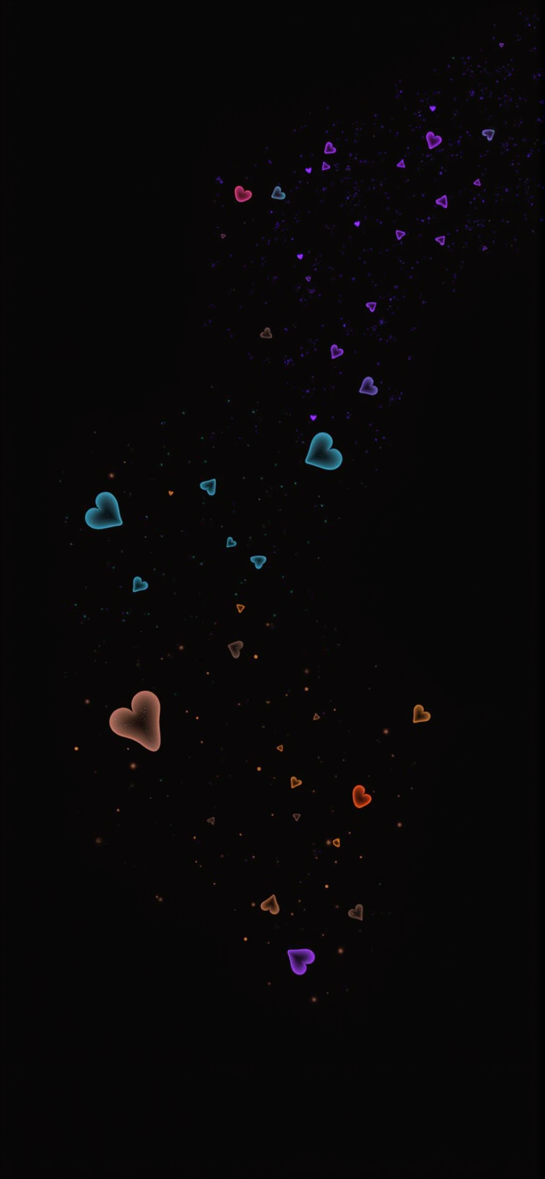 黑色背景上的数字插图,各种大小的彩色心向上升起。心形图案的颜色有粉色、紫色、蓝色和橙色,并发出发光的效果。心形的向上运动和黑色的背景给图像一种空灵而浪漫的感觉。