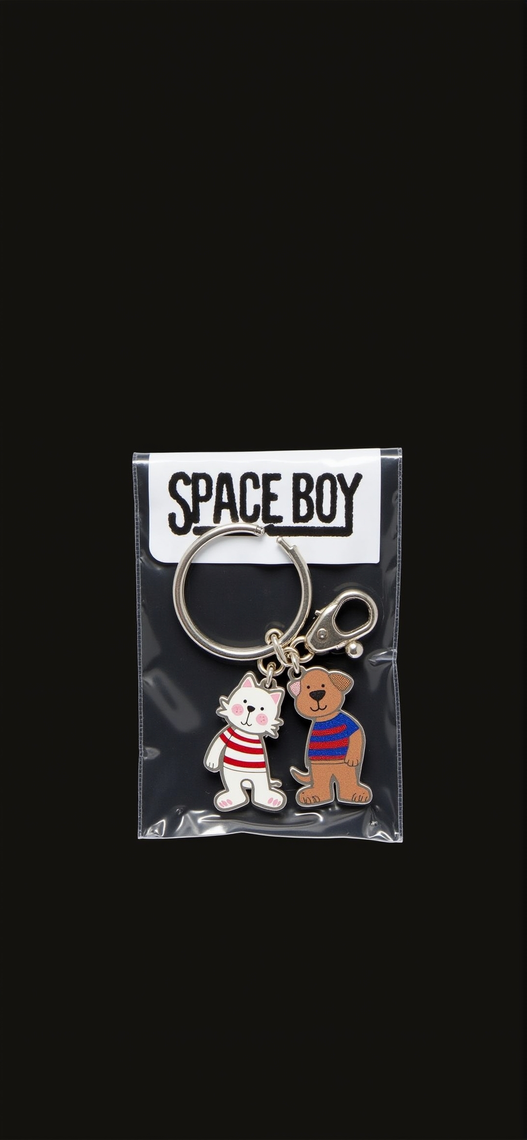 一个仍在包装中的新奇钥匙链的照片。钥匙扣的图案是一只卡通猫和一只狗,它们都穿着条纹衬衫,两条腿站立着。猫是白色的,上面有粉红色的细节,而狗是棕色的。它们悬挂在一条银链上,顶端有一个大环。钥匙扣附在硬纸板背面,上面用黑色印着“SPACE BOY”字样。