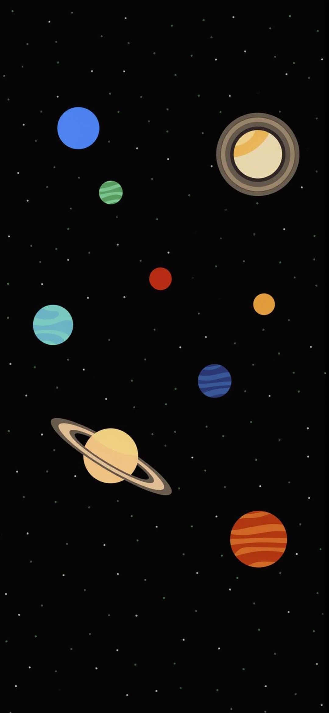 在极简主义的太阳系中,九大行星的渲染图像。在纯黑色的背景上点缀着代表恒星的白点,行星被描绘成简单的圆圈,有不同的颜色和图案,以表明它们的独特特征。土星和天王星这两颗行星因其突出的光环而与众不同。这幅图像唤起了一种巨大和惊奇的感觉,以一种简单的、几乎孩子气的方式突出了宇宙的美丽和秩序。行星的鲜艳色彩与黑暗的背景形成鲜明的对比,在视觉上很吸引人。