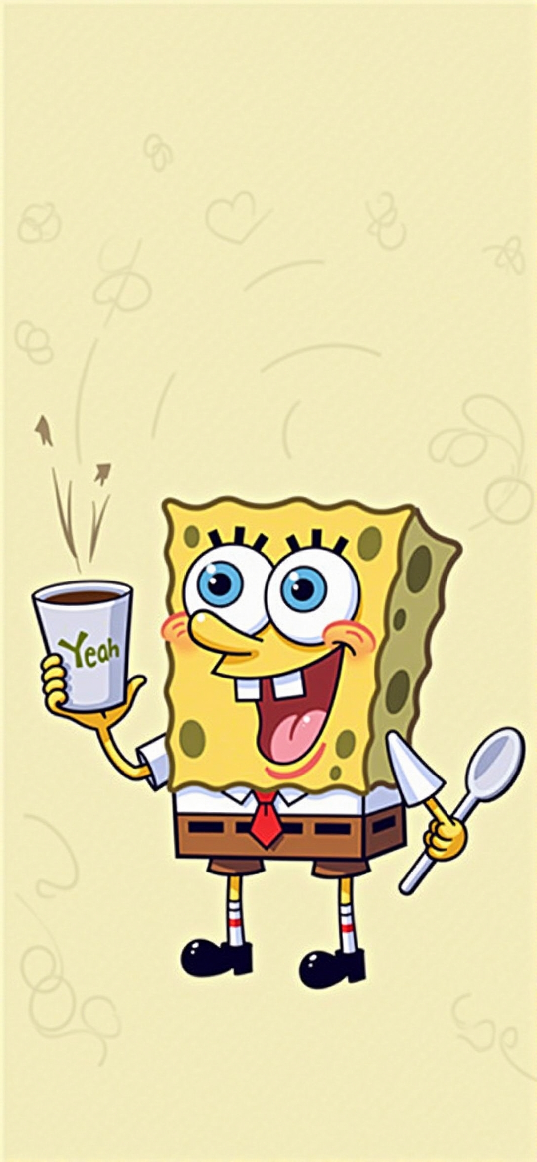卡通风格海绵宝宝活力早晨形象渲染,兴奋表情手持蒸汽咖啡杯