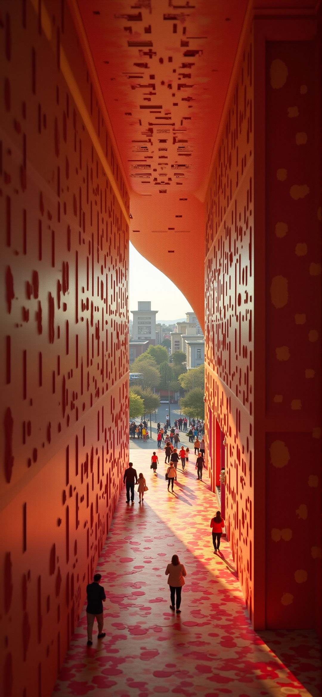 一个充满活力的现代走廊的照片,装饰着醒目的红色墙壁。墙壁上有独特的剪纸图案,为空间增添了深度和质感。阳光穿过走廊尽头的一个开口,用温暖诱人的光芒照亮了地板。几个人分散在走廊里,一些人走向灯光,另一些人则向远处退去。整体氛围是一种运动和能量,通过动态视角和光影的发挥来增强。图像质量很高,细节清晰,色彩鲜艳,这表明它可能是用高质量的相机拍摄的。