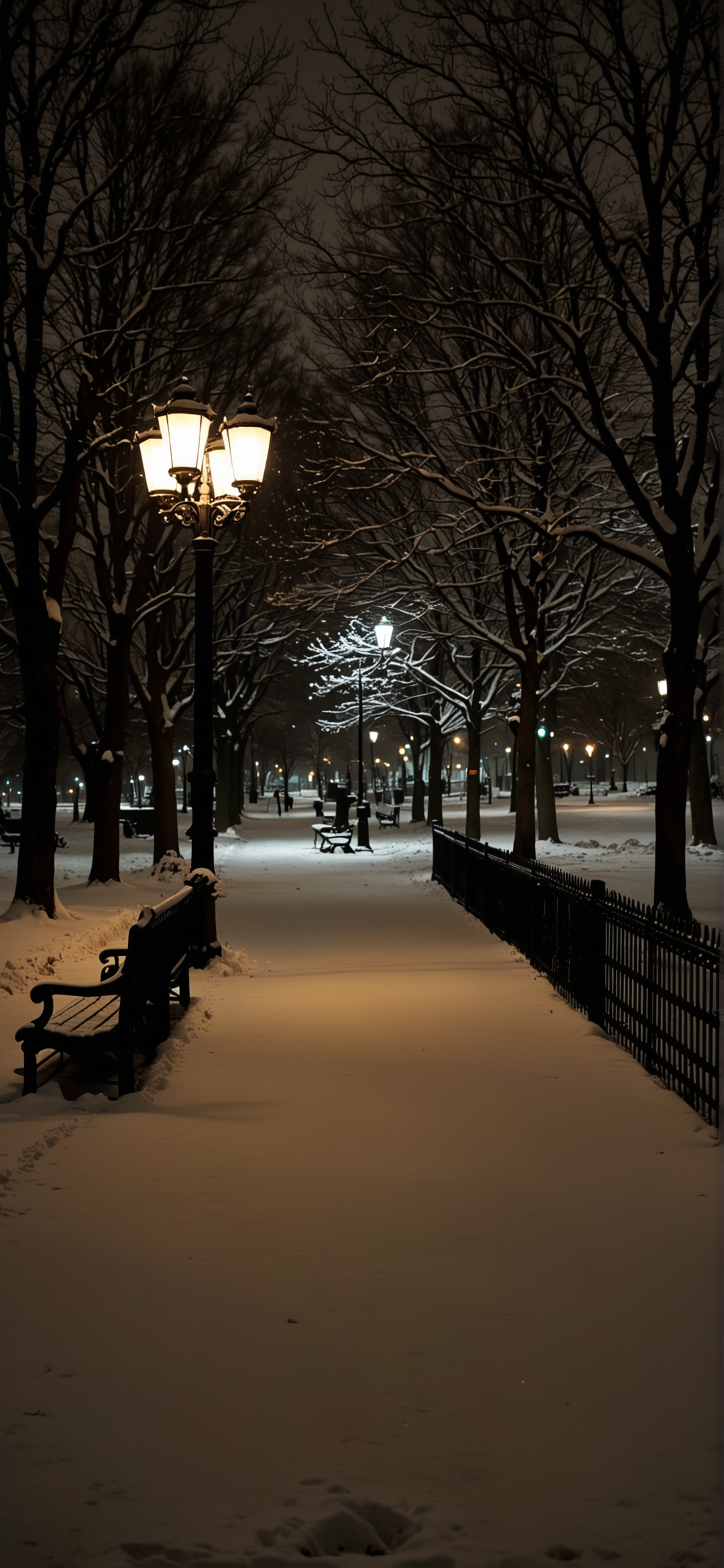 夜晚,白雪覆盖的公园小路被华丽的灯柱照亮。这条小路两旁是长凳和黑色的栅栏,向远处退去,两旁是一排排被雪覆盖的树木。温暖的街灯与寒冷的冬季黑暗形成鲜明对比,营造出一种宁静而诱人的氛围。新雪上的脚印暗示着最近的活动,但场景是荒凉的,传达了一种孤独和宁静的感觉。低角度的镜头强调了树木的高度和雪域的深度。