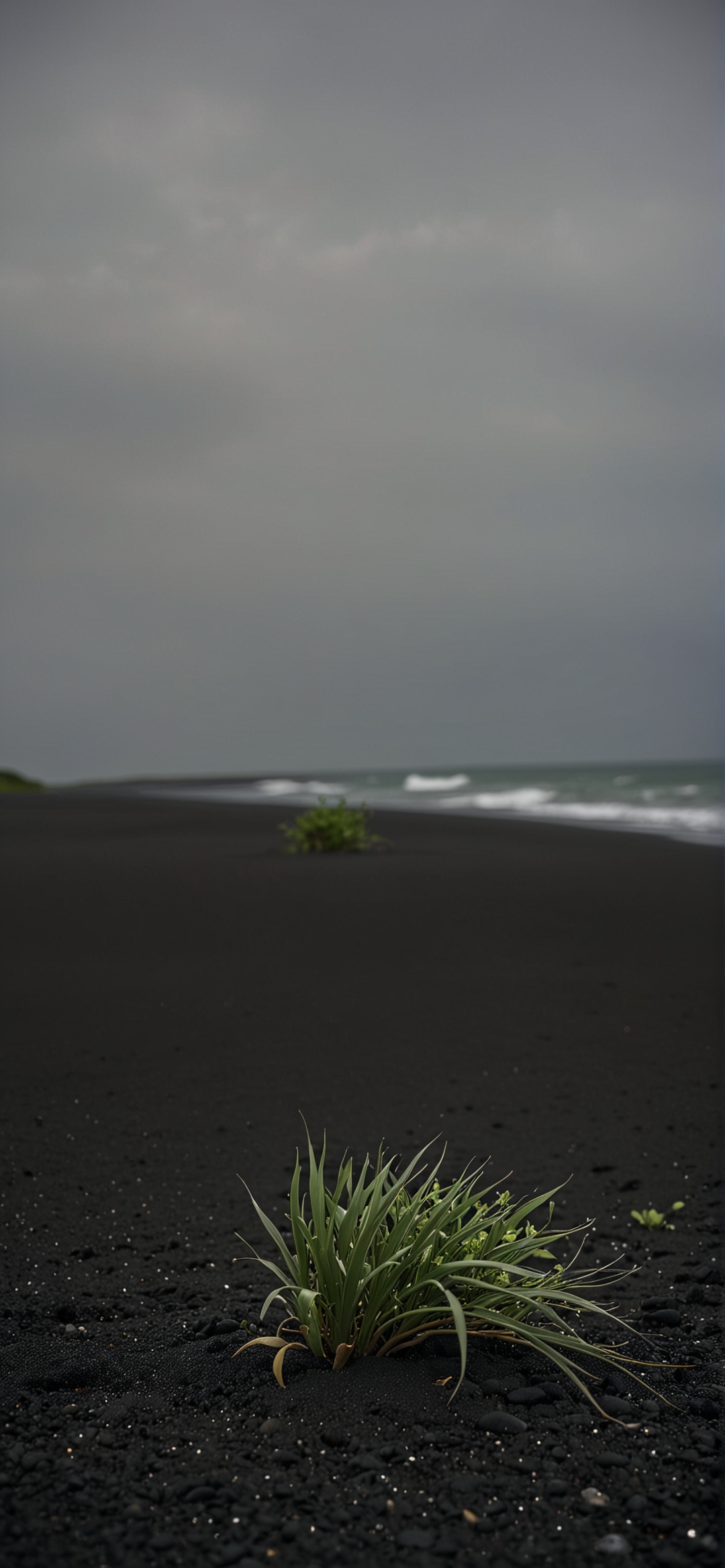 黑色沙滩上一株孤零零的植物的照片。这种植物,明亮的绿色,长而薄的叶子,在深色沙滩的鲜明对比中占据了中心位置。背景是模糊的海岸线,轻柔的海浪拍打着海岸。多云的天空营造出一种忧郁而宁静的气氛。浅景深使植物成为焦点,突出了它在戏剧性背景下的弹性。这幅画唤起了一种孤独的感觉和自然的持久力量。