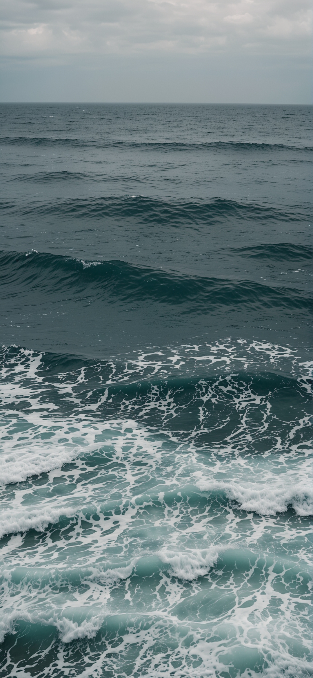 多云的天空下,汹涌的大海。画面以各种深浅不一的蓝色和灰色为主,反映出忧郁的气氛。这张照片是从高处拍摄的,捕捉到了海面的广角视角。波浪起伏不定,在较暗的水面上形成白色泡沫的图案。地平线在远处清晰可见,将水与阴天分开。构图强调了海洋的原始力量和无边无际。
