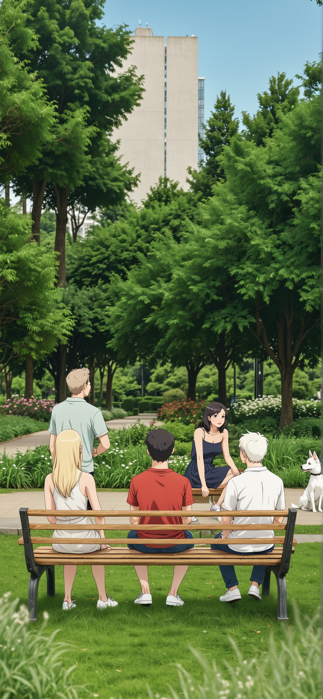 五个朋友坐在公园的长椅上。从长凳后面的视角,从低角度捕捉人群。郁郁葱葱的绿色公园占据了背景,树木之间隐约可见一座高层建筑。长凳上的四个人,两男两女,看起来20多岁,正在交谈,背对着观众。他们随意的服装和放松的姿势表明这是一次无忧无虑的聚会。图像的整体风格让人联想到漫画小说或动漫,线条简洁,色彩鲜艳。