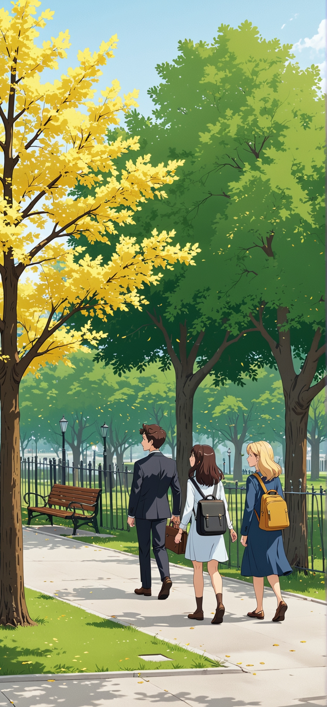 三个学生走在穿过公园的小路上的渲染图像。场景设定在白天,沐浴在温暖的阳光中,透过绿树的树冠。两个女孩,一个留着棕色短发,另一个留着金色长发,走在一个深色头发、西装革履、提着公文包的男孩前面。女孩们穿着白色和海军蓝的制服,背着背包,穿着舒适的鞋子。左边一棵色彩鲜艳的树上落下的黄叶增添了秋天的感觉。这种风格让人想起日本动画,线条简洁,注重光影。整体色调明亮欢快,捕捉了青春的活力和秋高气爽的美丽。