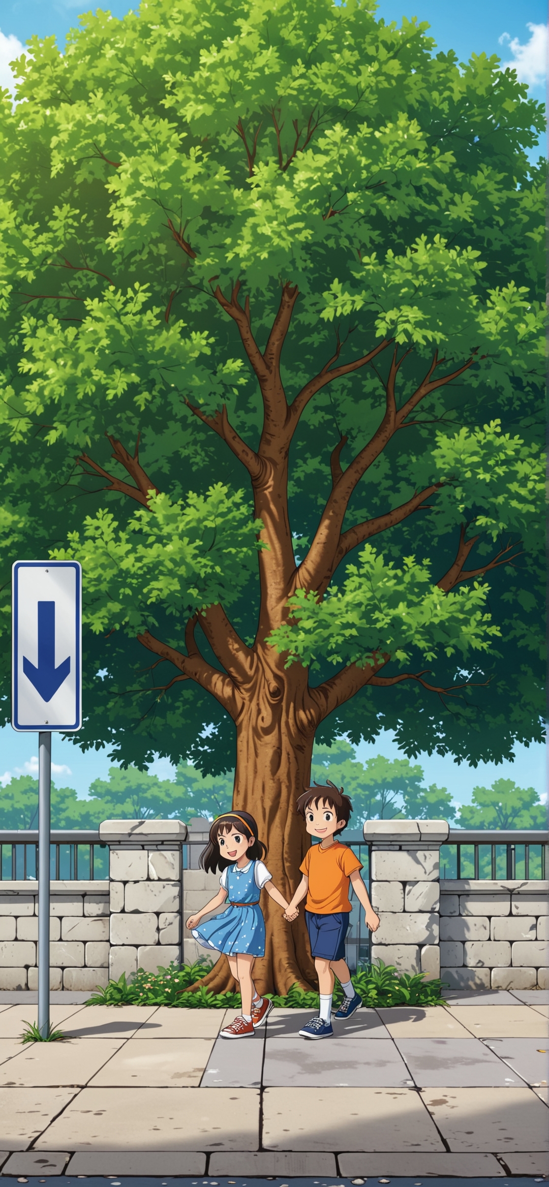 温馨怀旧画风描绘两孩童手牵手沿街快乐行走