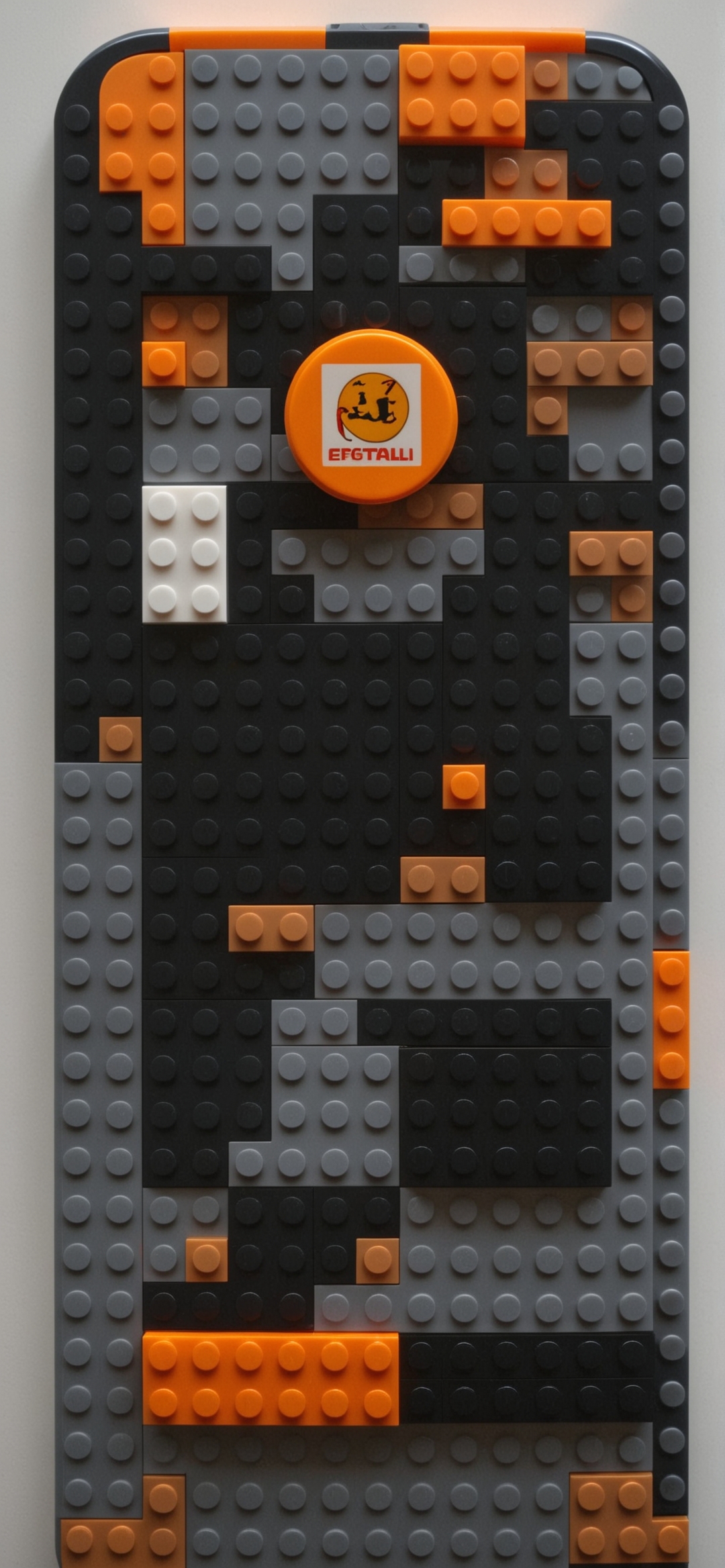 以像素艺术模式排列的乐高积木覆盖的平面照片。大部分砖块都是黑色和灰色,零星的橙色和棕色砖块形成一个抽象的设计。一块白色的砖在黑暗的背景下显得格外显眼。在中心,一个亮橙色的圆形物体,上面写着“EFGTALLI”和一个风格化的标志,被放置在砖块上。这张照片是从一个直接的俯视角度拍摄的,强调了构图的平整度和砖块的几何排列。砖块明亮的颜色和白色的背景创造了一个高对比度的图像。