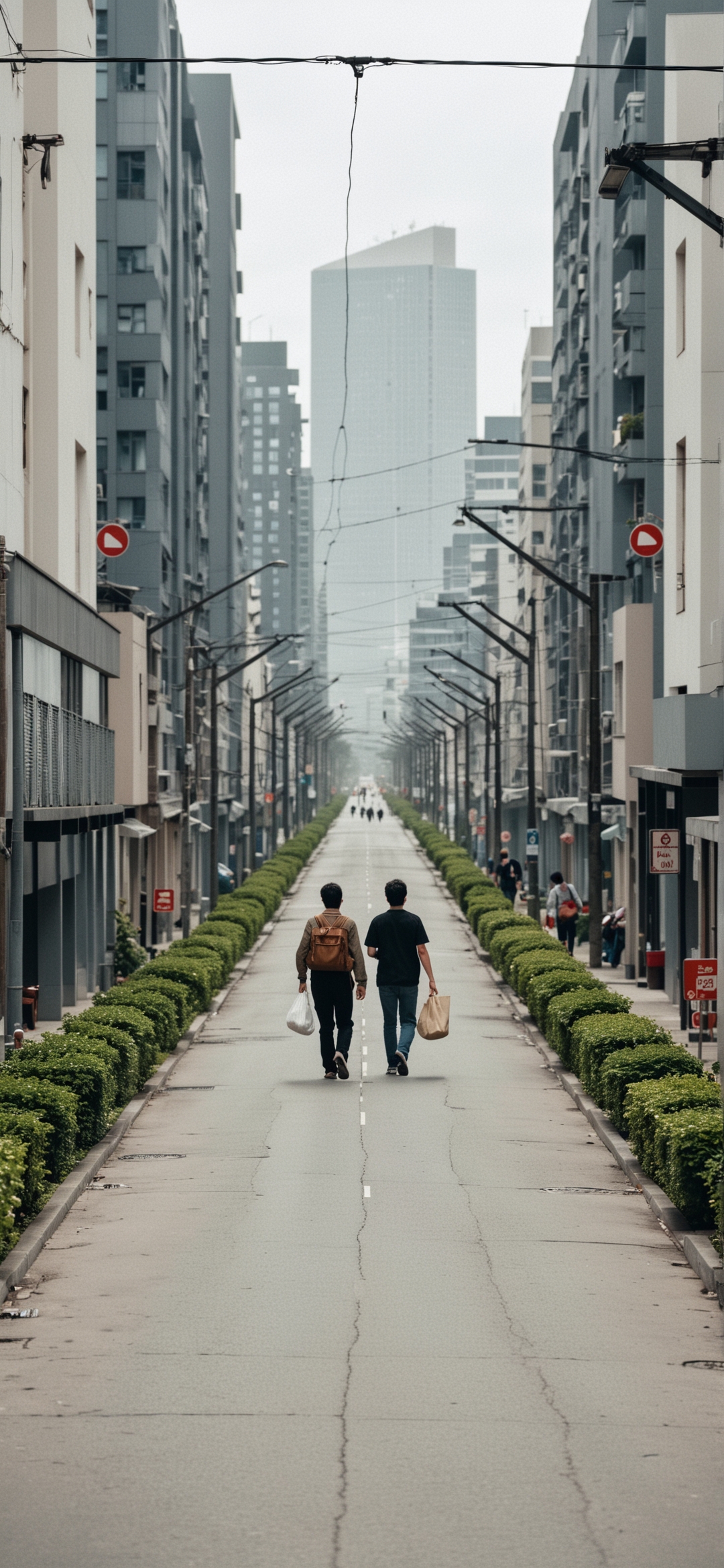 两名男子在看似空荡荡的街道上从镜头前走开的照片。男人们走在小巷的中央,朝着消失点走去。这张照片是在街道上拍摄的。两个人都提着棕色纸袋。街道两侧高耸的建筑构成了图像的框架,强调了城市环境的高度和规模。两边的人行道上排列着绿色的树篱。调色板是柔和和去饱和的。在街的尽头有更多的人走向摄像机。