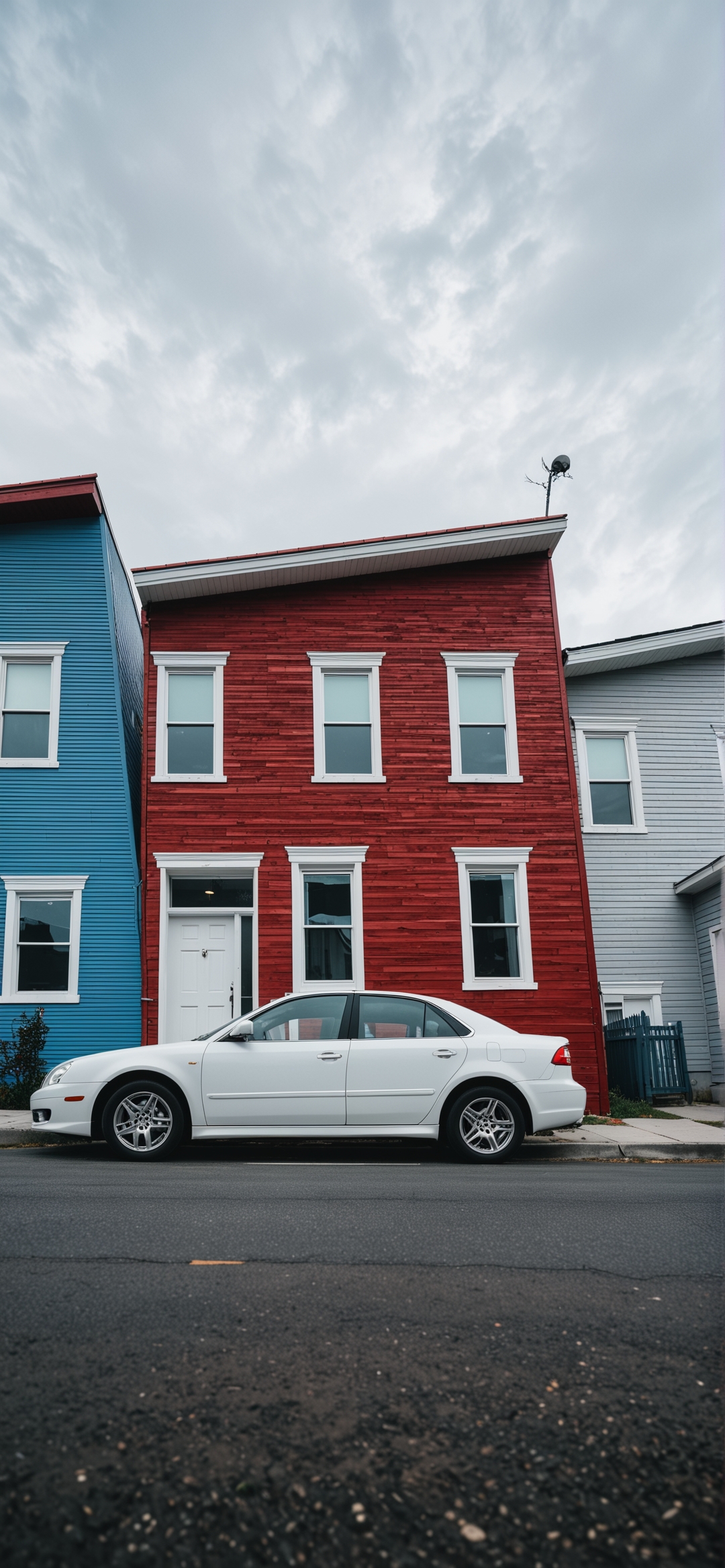 一辆白色轿车停在一条安静的街道上,前面是一排五颜六色的房子。房子被漆成鲜艳的红色和蓝色,营造出欢快迷人的氛围。汽车直接停在红房子的前面,房子有一个独特的倾斜屋顶。房子的窗户都关着,画面中看不到人。照片的整体色调明亮而通风,由于上方多云的天空,色调略显柔和。