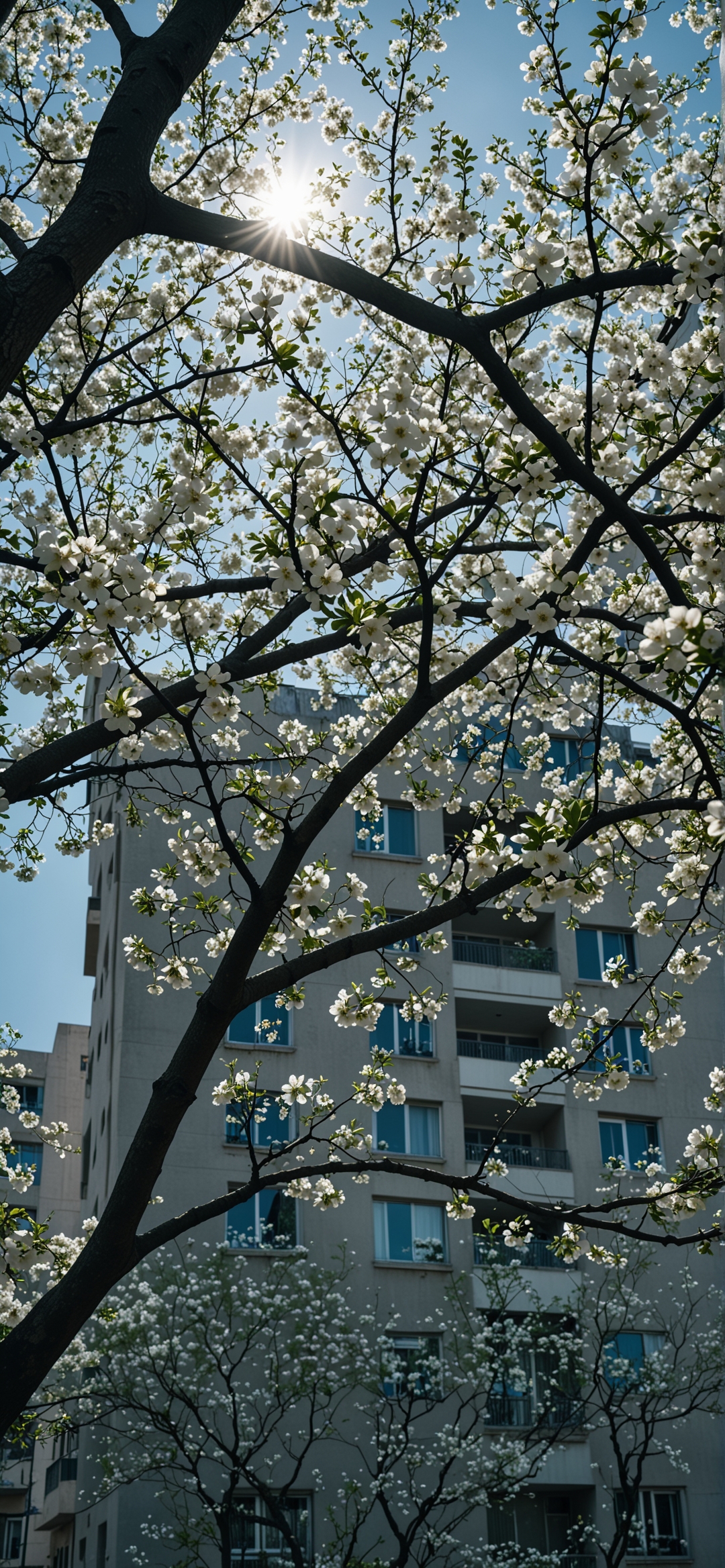 城市春色:透过白花盛开的树枝仰望天空的生机与建筑之美