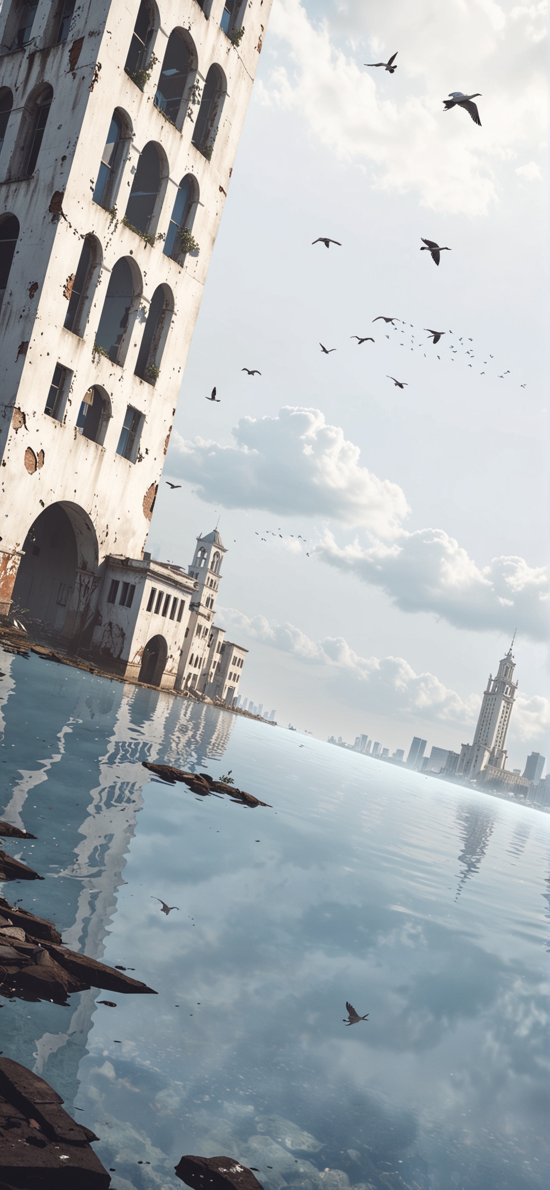 描绘了一个反乌托邦的未来,海平面上升淹没了一座城市。这张照片是从一个较低的有利位置拍摄的,聚焦在一座摇摇欲坠的白塔上。它的窗户破碎,墙壁污迹斑斑,植物从裂缝中萌芽。其他几座建筑,包括一座著名的钟楼,部分被淹没在背景中。一群鸟飞过头顶,在多云的天空和平静的水面上投下转瞬即逝的影子,反射出城市的风景和天空。调色板是柔和的,唤起一种荒凉和腐朽的感觉。