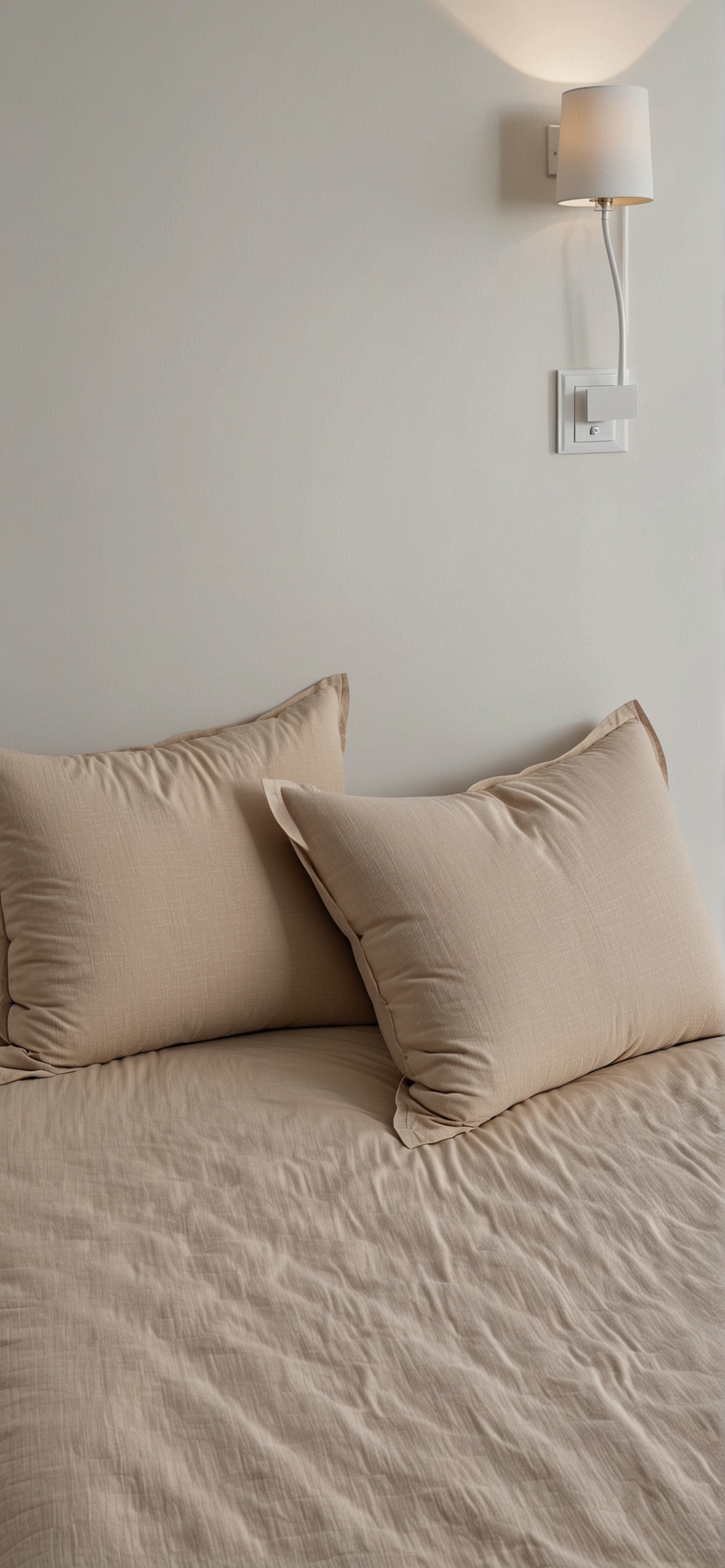 一张铺得整整齐齐的床,米色的床上用品衬着朴素的墙壁。床上有两个枕头,前面的一个稍微放在另一个上面。图片展示了织物的纹理和床单上微妙的褶皱效果。床上方安装了一盏光滑的白色弧形壁灯,在墙上投射出柔和的光芒。图像的整体美学唤起了一种平静和极简主义的感觉。