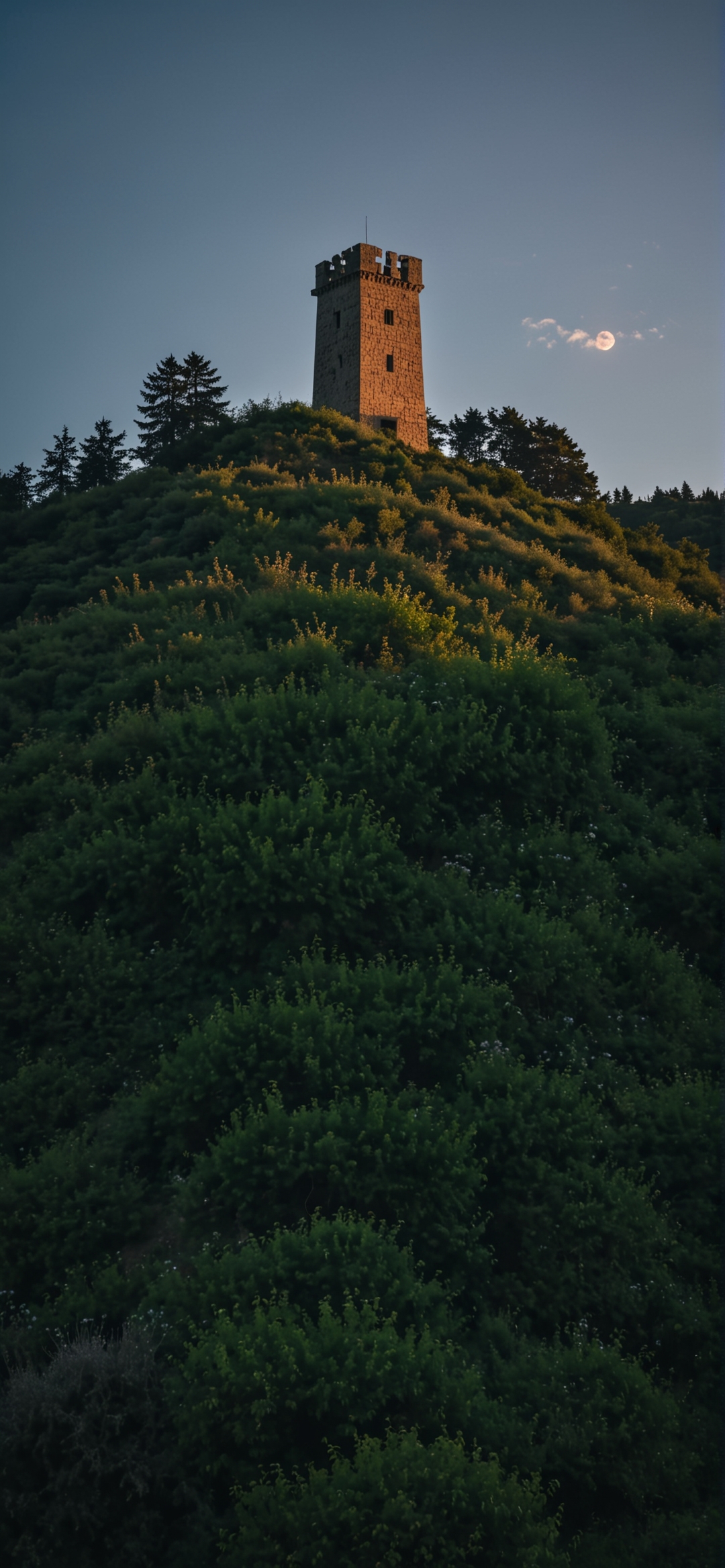 翠绿的小山上矗立着一座孤零零的石塔。这座塔沐浴在夕阳的金色光芒中,在晴朗的暮色中显得格外显眼。其锯齿状的顶部和粗糙的石头结构暗示着古老的过去。一轮又小又白的满月,高高地挂在钟楼右边的天空上。山坡上密密麻麻地覆盖着郁郁葱葱的绿叶,给人一种宁静的感觉。整体构图以塔为中心,以天空和月亮为背景,创造出一种宁静和奇妙的感觉。