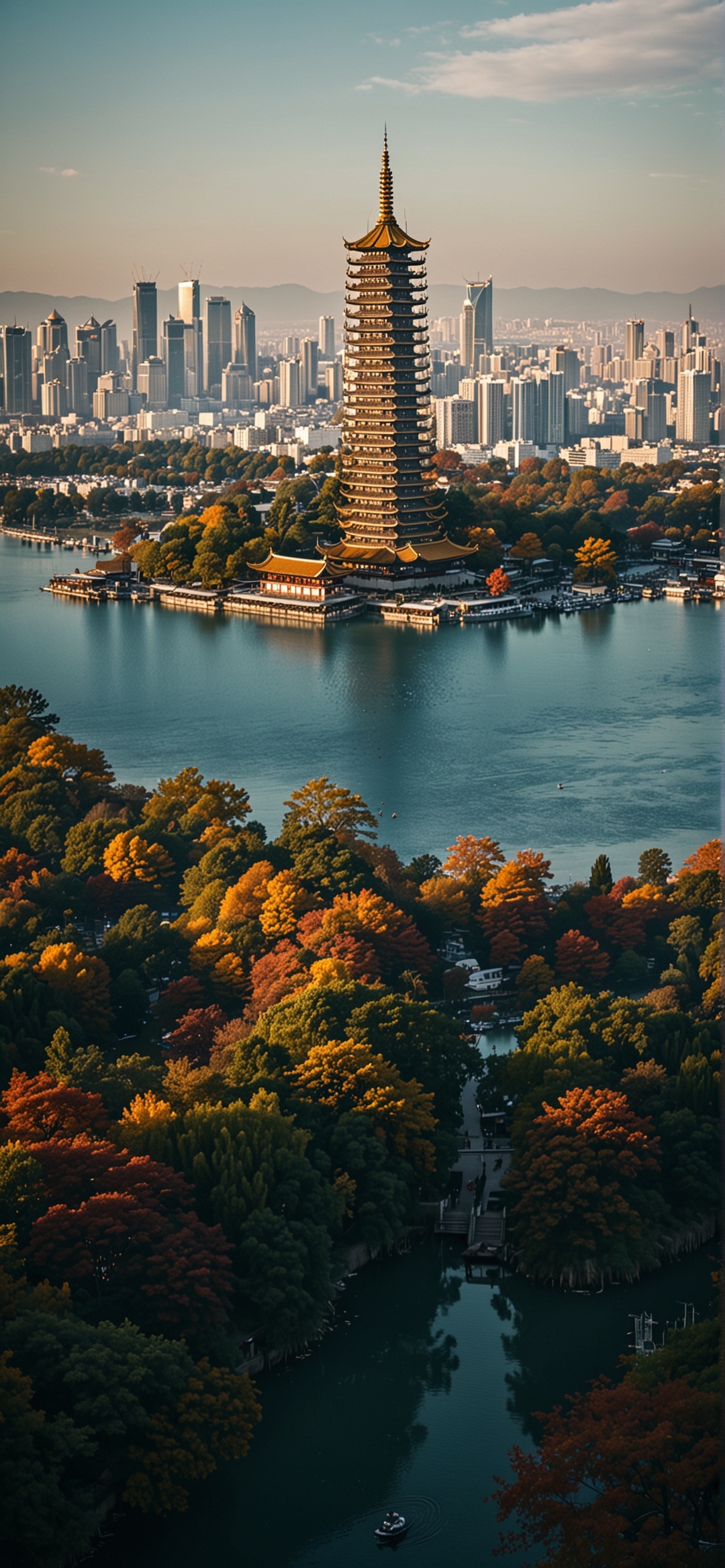 一座传统的中国宝塔坐落在宁静的湖面上,映衬着现代城市的背景。这张照片是从一个很高的有利位置拍摄的,展示了远处广阔的水域和城市天际线。图片的下半部分是郁郁葱葱的绿色植物,点缀着充满活力的秋天的红色、黄色和橙色。这座宝塔,有着复杂的金色和红色的细节,是焦点,它的倒影在湖面上闪烁。前景中,一艘孤独的小船在平静的水面上滑行。古老的建筑,繁华的城市景观和宁静的自然美景并置,创造了一个迷人的场景。