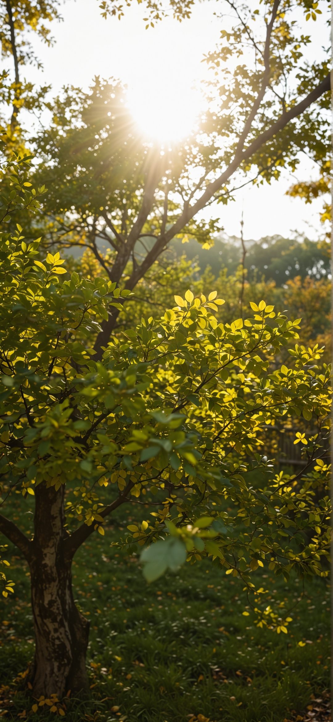 落日余晖下的树木剪影:星芒梦幻秋意渐浓