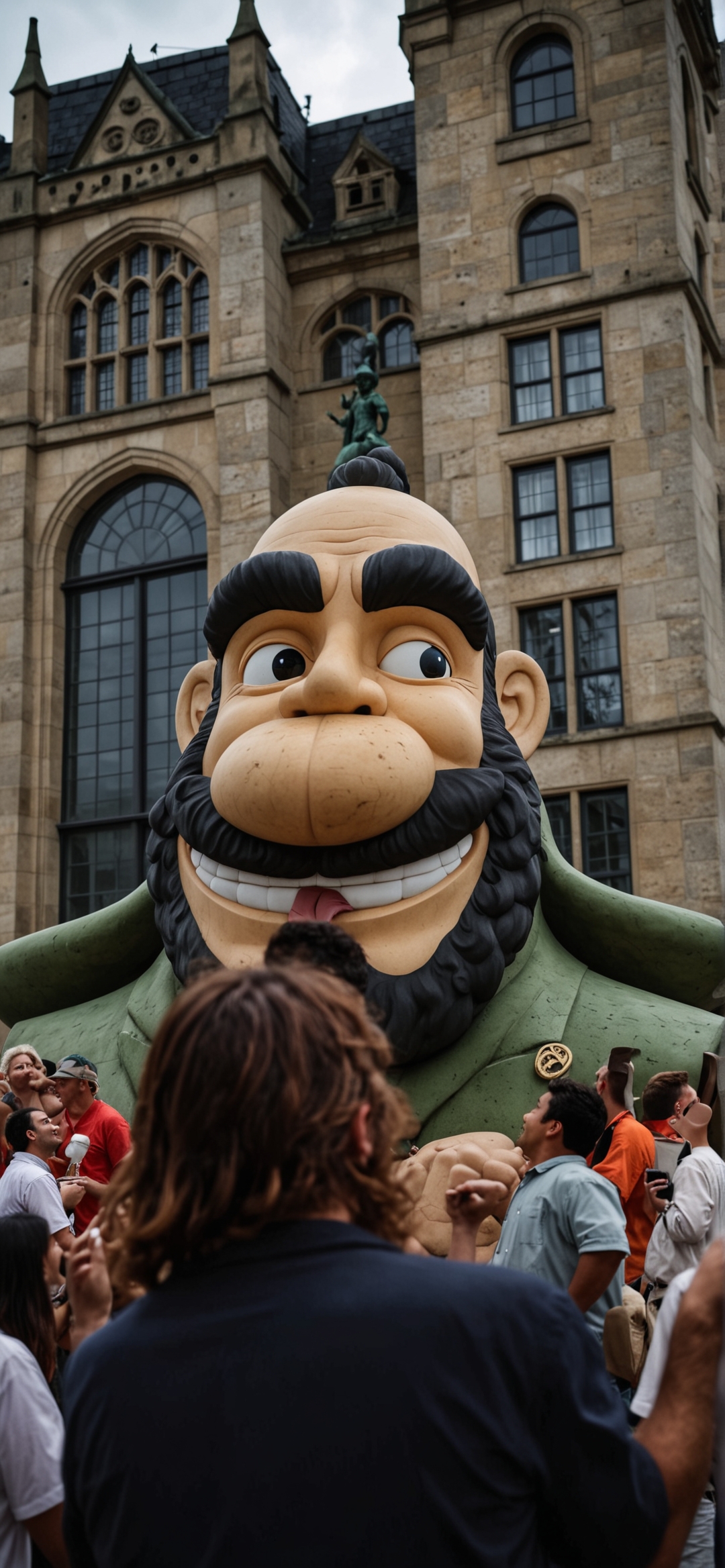 一个巨大的充气漫画,一个男人站在一座庄严的建筑前。这幅漫画具有夸张的特征,包括一个大脑袋、浓密的眉毛和一个宽阔的咧嘴笑。它穿着一件绿色的夹克,似乎是公共活动的一部分。一群不同年龄和种族的人聚集在充气娃娃周围,一些人在拍照,另一些人则在欣赏这一奇观。这个视角是从一个留着棕色长发的人身后拍摄的,聚焦于他们对场景的看法。整体基调是轻松愉快的节日气氛。背景中的建筑以高大的拱形窗户和复杂的石雕为特色,暗示着一个历史或文化机构。