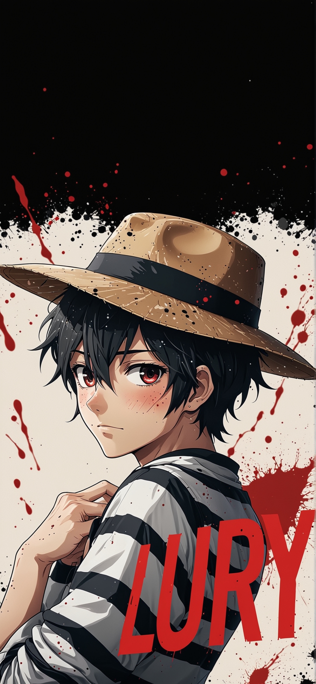 这是一个年轻人的数字插图与冷静和叛逆的风度。他有一头乱蓬蓬的黑发,醒目的红眼睛,脸上有几颗淡淡的雀斑。他头戴一顶棕褐色宽边草帽,身穿黑白条纹衬衫,让人想起囚犯的制服。这个男人微微侧过身来,带着一种自信的、近乎挑衅的表情盯着观众。他的手轻轻地放在肩膀上,进一步强调了他放松而自信的姿势。背景是纯黑色,带有风格化的红色飞溅,类似于血液,增加了插图的整体前卫和强烈的氛围。“LURY”这个词醒目地印在图片的下半部分,用的是大大的红色大写字母,很可能表示与这个角色有关的名字或头衔。