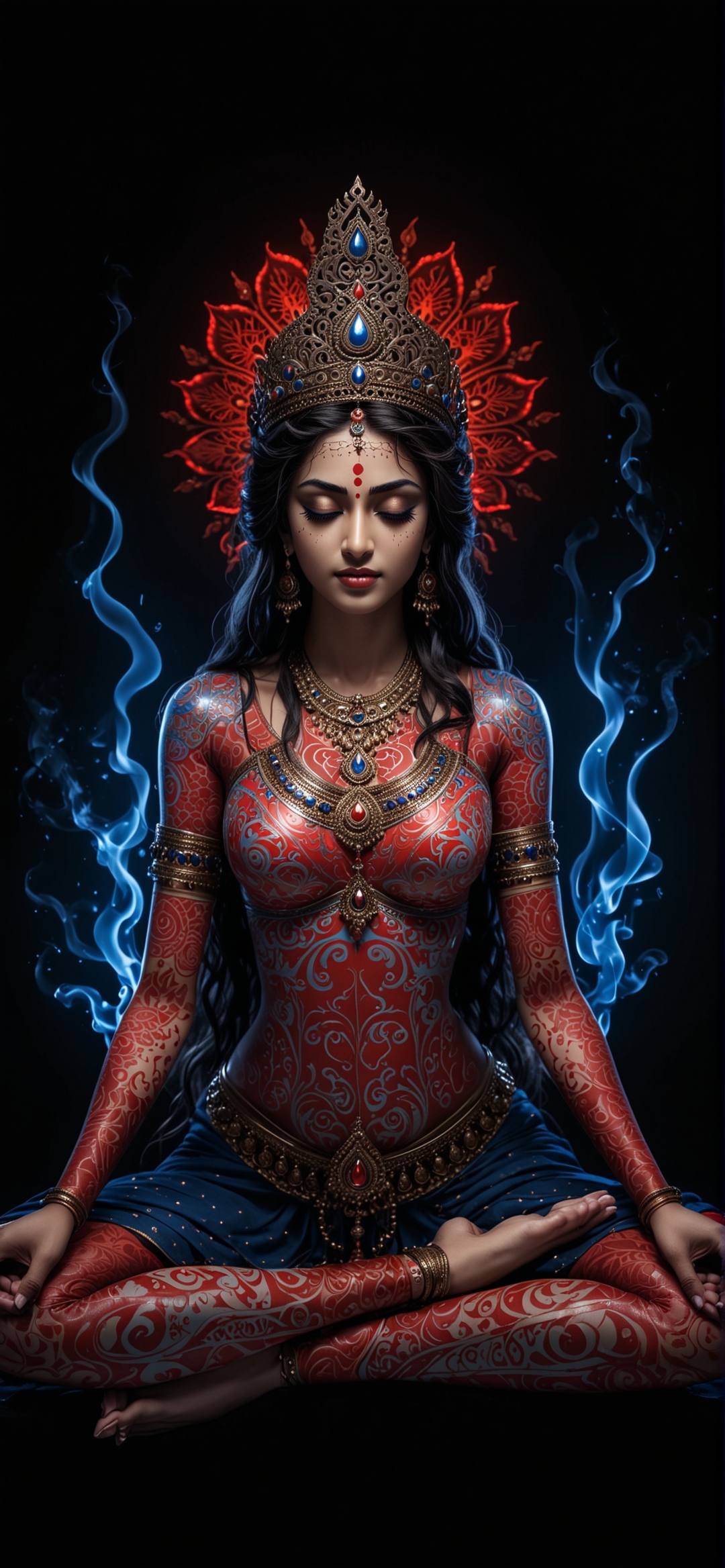 冥想姿态的印度教女神风格女性画像,以卡莉为灵感,身着华贵金饰与纹身艺术