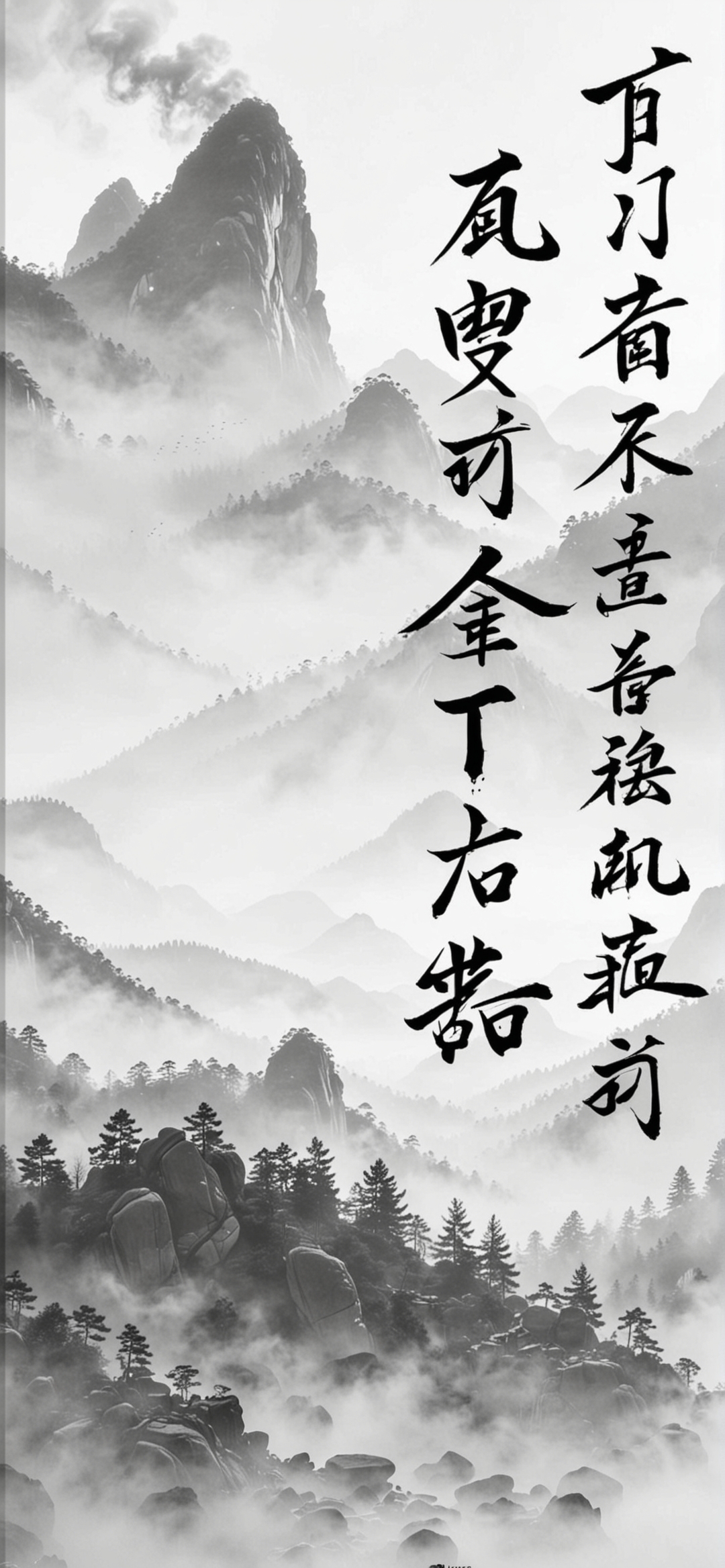 中国传统山水画渲染:朦胧山峰与墨色松林交织的宁静画面
