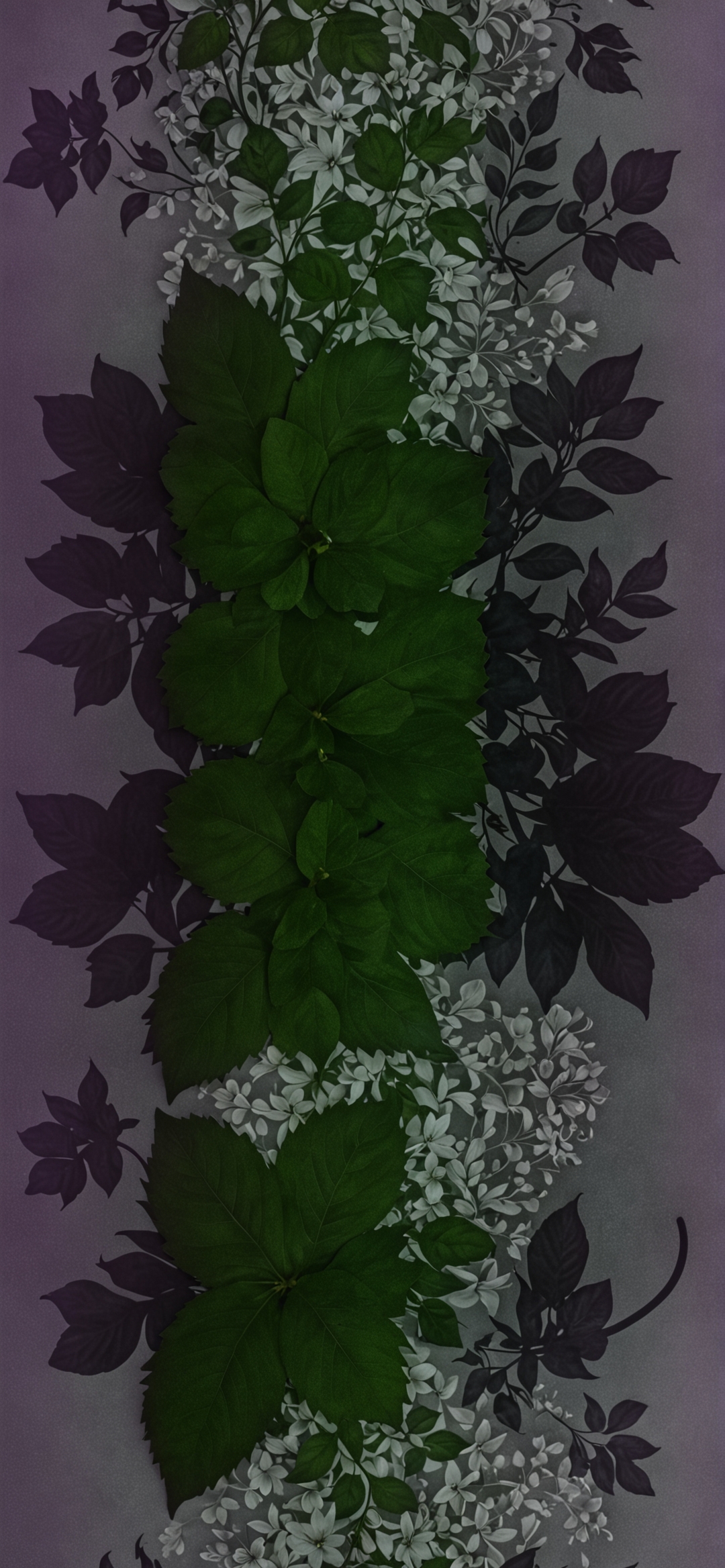 这是一个花卉图案的渲染图。背景有一个微妙的渐变从深紫色过渡到浅灰色调。图案本身是由一边的深色剪影叶子和另一边充满活力的绿色叶子混合着白色的花朵组成的。黑暗和充满活力的元素之间的对比创造了一种深度感。图像的整体风格让人想起复古的植物插图,带有现代的,分层的扭曲。