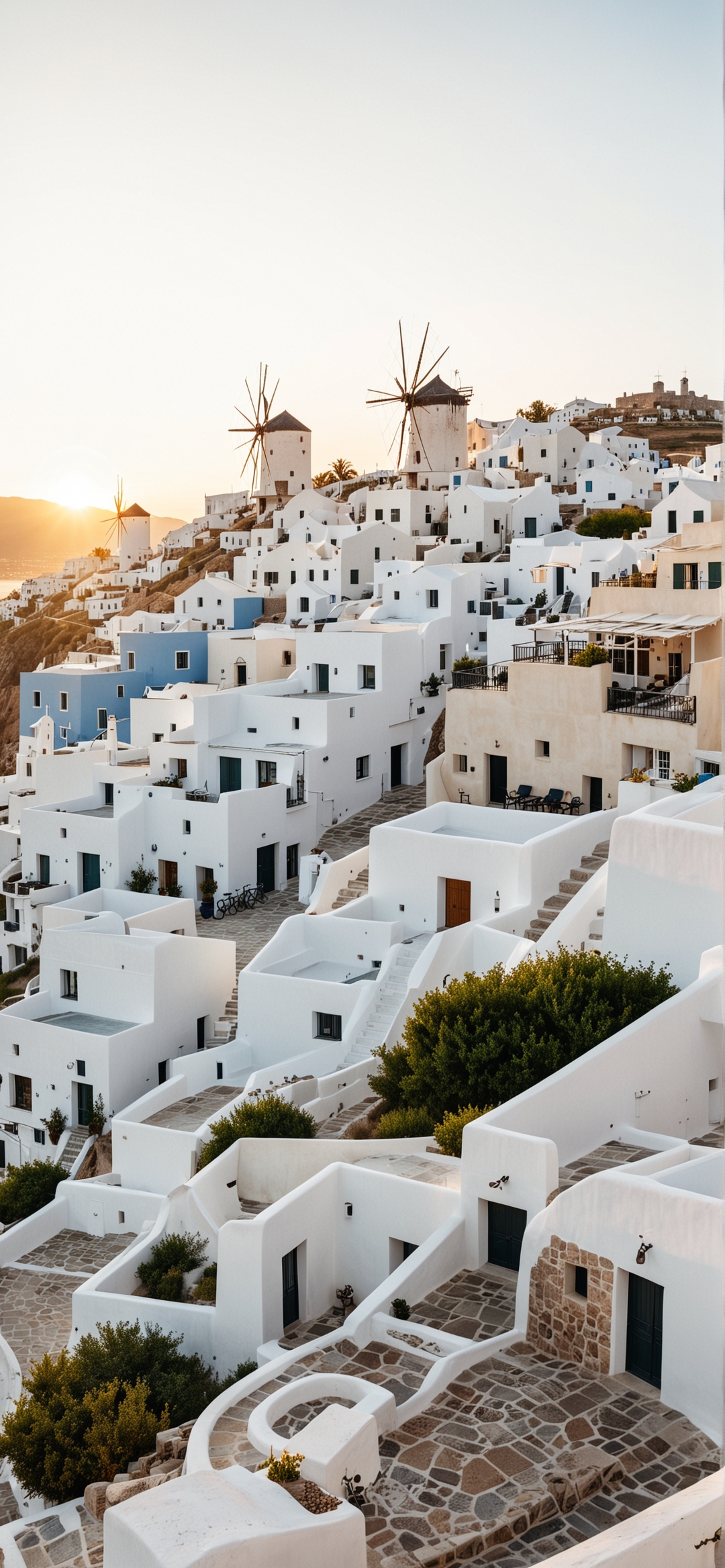 粉刷过的房屋紧贴在山坡上,向远处的海岸线倾泻而下。传统的希腊风车矗立在山脊上,映衬着日出或日落的柔和色调。这些建筑以白色为主,点缀着蓝色和米色,展示了现代与传统建筑的迷人融合。石头小径蜿蜒穿过场景,它们粗糙的纹理与光滑的墙壁形成鲜明对比。这张照片是从高处拍摄的,捕捉到了沐浴在田园诗般的景色中的夕阳的温暖。