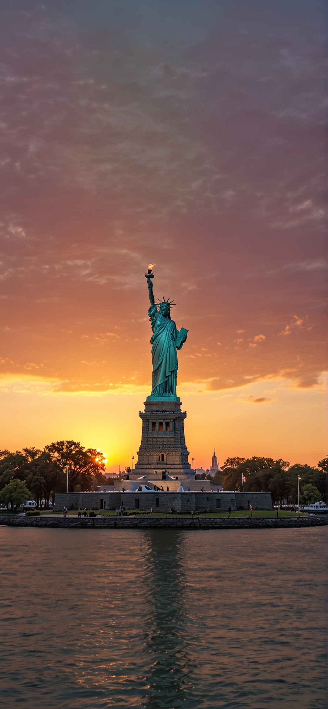 这是一张自由女神像在落日的映衬下的照片。这座标志性的铜绿雕像高高地矗立在底座上,火炬高高举起,映衬着暖色调的天空。这张照片是从一个较低的有利位置拍摄的,很可能是从水中的一艘船上拍摄的,强调了雕像的宏伟。夕阳将天空沐浴在橙色、红色和紫色的鲜艳调色板中,在水面和周围的景观上投下温暖的光芒。水面平静,反射着天空的颜色和雕像的轮廓。这幅作品捕捉了这个世界著名的自由和民主象征的经典和标志性的观点。