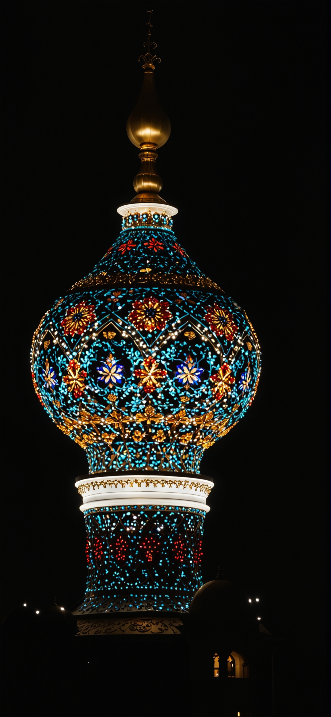 一个华丽的圆顶在夜晚被五颜六色的灯光复杂地装饰着。圆顶形状像洋葱,在黑色背景上有蓝色、金色和红色的灯光图案。一个金色的尖顶坐落在圆顶上,它由一个白色的底座支撑,上面装饰着更多的蓝色和红色的灯。这张照片是从一个低角度拍摄的,强调了穹顶在黑暗天空下的高度和宏伟。
