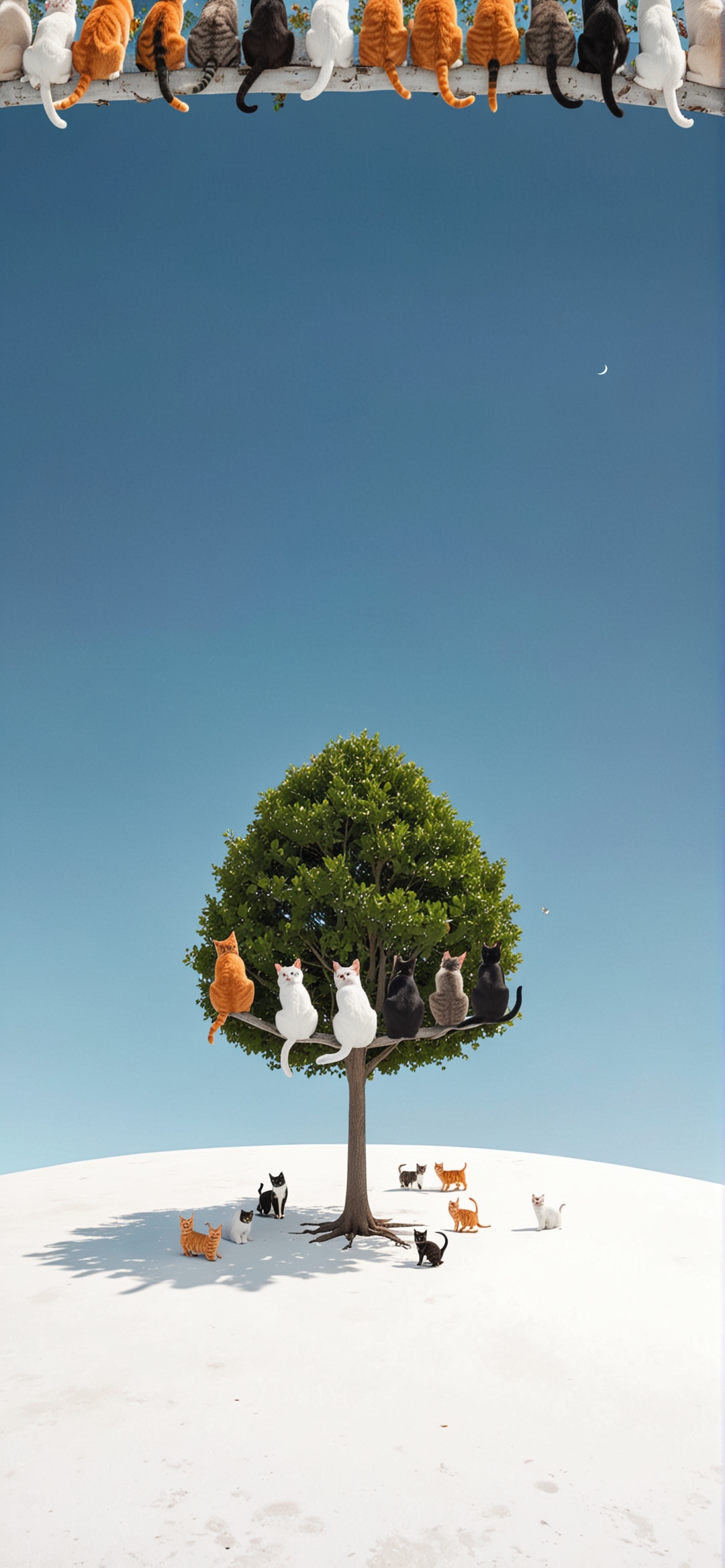 在一个超现实的风景中渲染了许多猫的图像。九只皮毛颜色各异的猫在一根粗树枝上排成一排,向观众展示它们的背部。在他们下面,一棵孤零零的树,顶着亮绿色的树冠,矗立在像雪一样光滑的白色地面上。另外六只猫,大多是姜黄色和白色的,散布在树的底部。另一只猫坐在树叶中的树枝上。背景是湛蓝的天空,给画面增添了宁静和异想天开的气氛。该图像利用高角度透视来创造一种深度感。