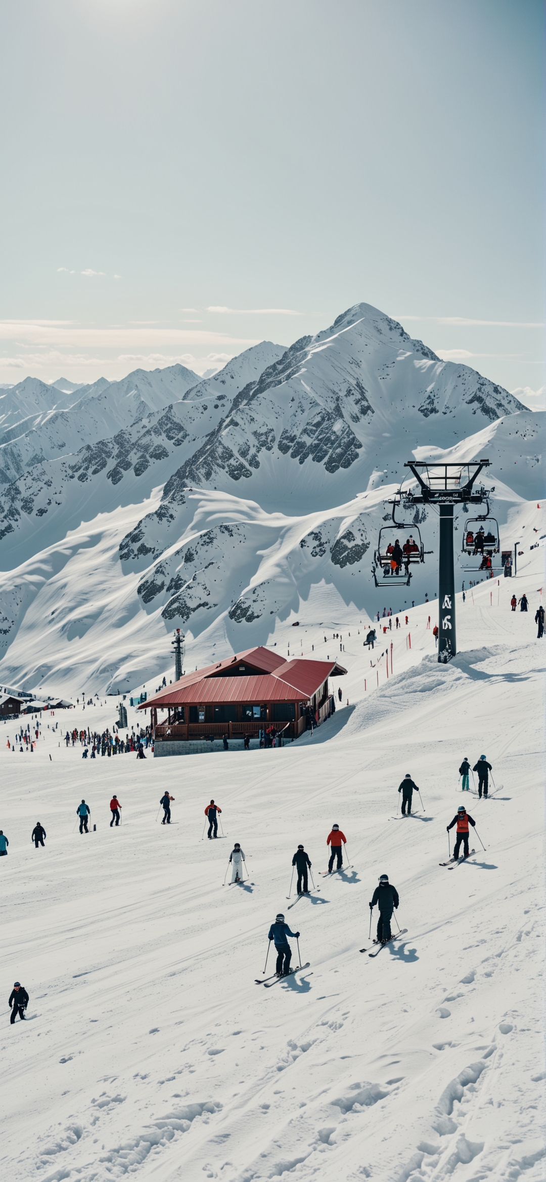 在一个阳光明媚的冬日,滑雪胜地的照片。这张照片是从一个很高的有利位置拍摄的,俯视着一个有许多滑雪者正在下降的斜坡。背景的斜坡上有一架缆车,山脚下有一座红色的小木屋。雄伟的白雪皑皑的山峰主宰了地平线,横跨整个背景。在某些地区,雪看起来是原始的,未被破坏过,而在另一些地区,它显示了滑雪者的痕迹。这景象沐浴在明媚的阳光下,在雪地上投下长长的影子。