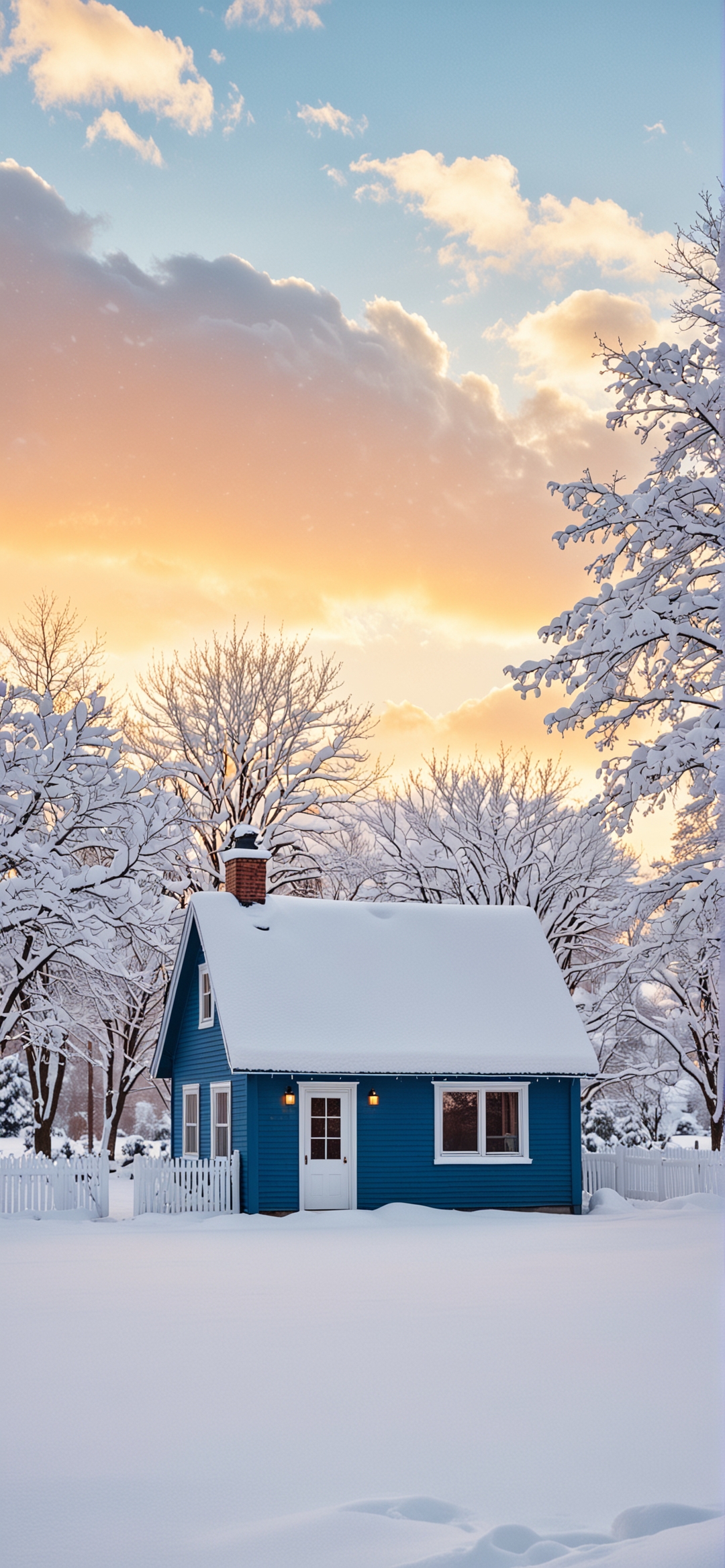 白雪覆盖的迷人蓝色小屋的照片。这座房子的屋顶被雪覆盖,窗户发光,在令人惊叹的冬日日落的背景下显得格外显眼。天空充满了柔和的色彩,从地平线上的淡粉色和橙色到更高的柔和蓝色。白雪覆盖的树木构成了这一场景,它们光秃秃的树枝在充满活力的天空下形成了精致的图案。白色的尖桩栅栏包围了物业,增加了宁静和风景如画的氛围。这张照片唤起了一种和平与宁静的感觉,捕捉了经典冬季景色的美丽。
