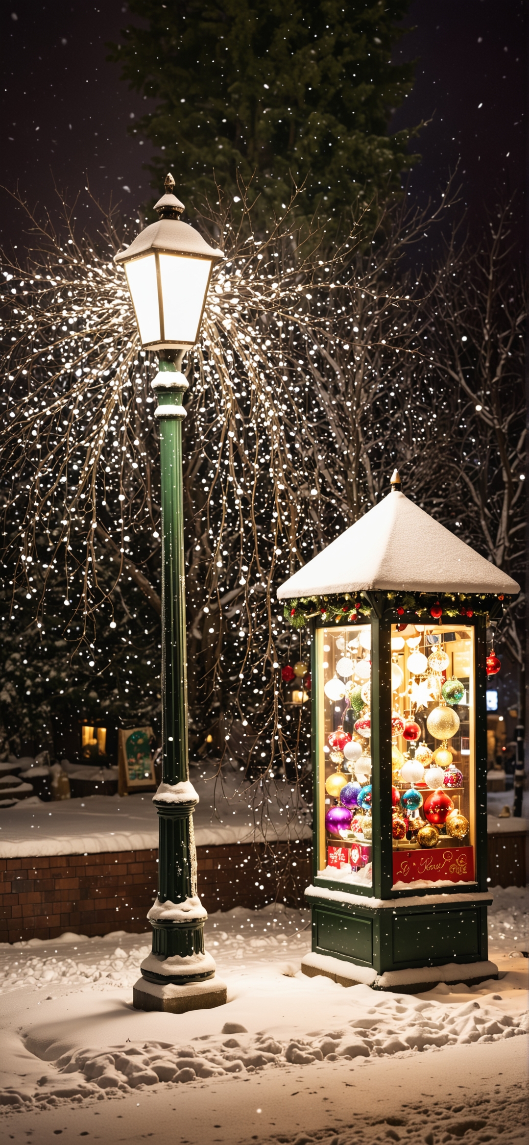 夜雪中的圣诞魔法:复古装饰亭与雪覆盖街灯交织的温馨节日画面