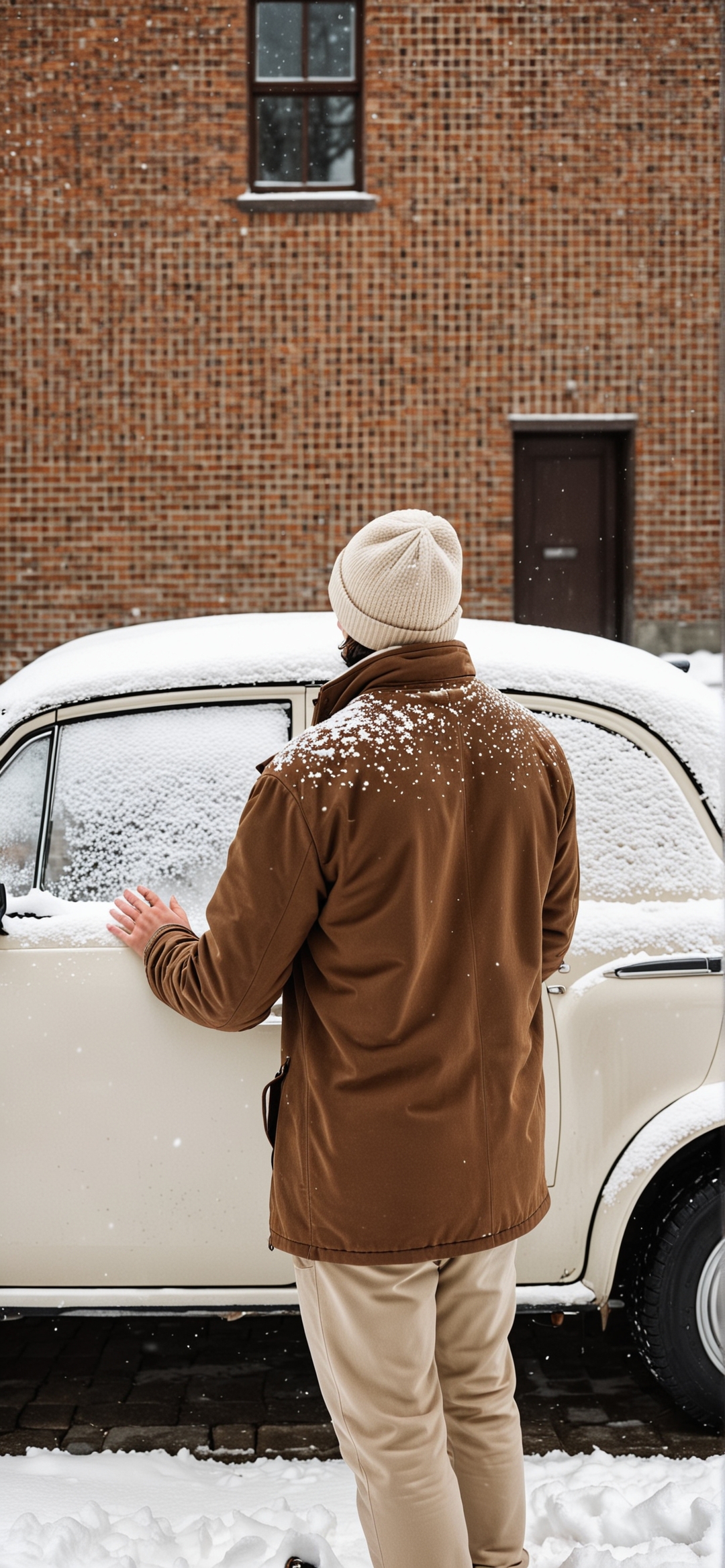 一名男子站在积雪覆盖的汽车旁。这名男子身穿棕色夹克,米色裤子,戴着一顶奶油色的无边帽,背对着镜头从后面拍摄。他在摸车窗上的雪。这辆车部分被雪覆盖,颜色较浅,停在一座棕色砖砌建筑前的砖砌车道上。这座建筑在汽车上方有一扇可见的窗户,右边有一扇棕色的门。雪花轻轻飘落,落在男人的背上和车上。这张照片的色调很冷,略带柔和,让人联想到冬天的一天。