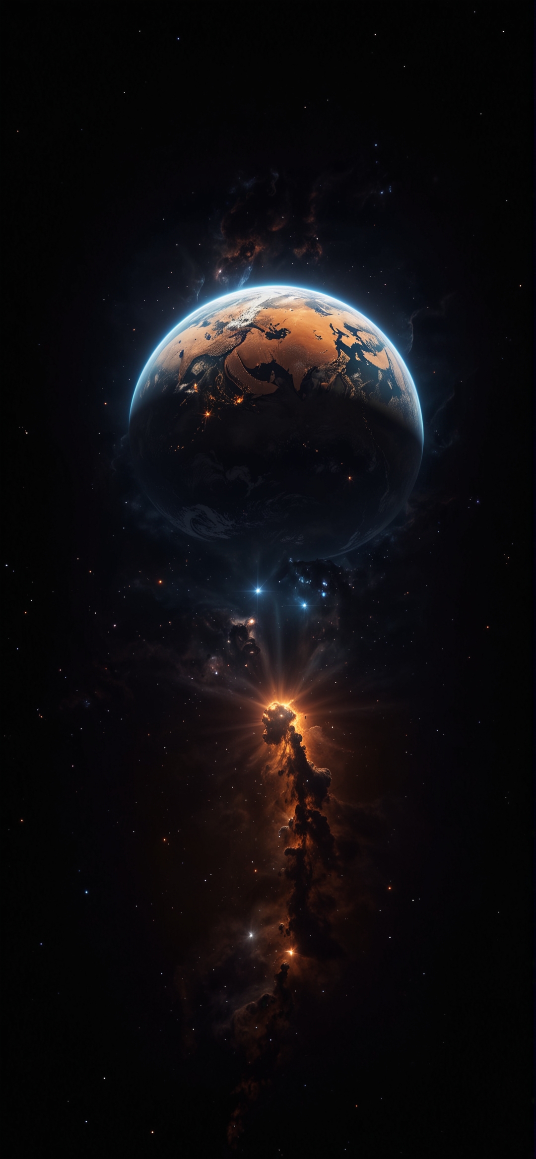 地球在太空中的渲染图像。这张照片显示了从太空中看到的地球,位于画面上半部分的中心。一个带有橙色条纹的黑暗不祥星云从地下散发出来,几乎延伸到地球。背景的其余部分是黑暗的,布满了小星星。这幅图像唤起了一种奇妙的感觉和广阔的空间。整体色调暗冷。这张数字图像被渲染成超现实主义的美学。