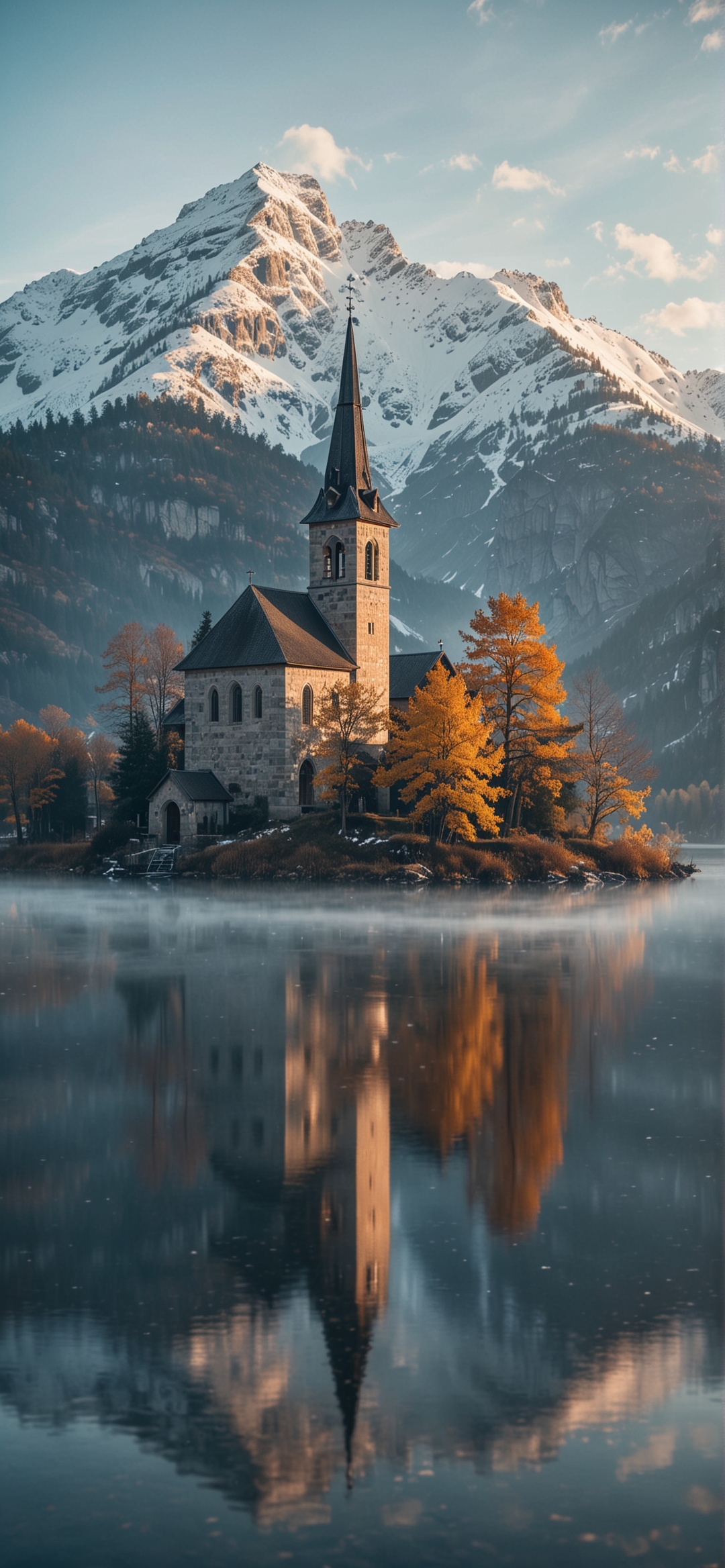湖心岛上的宁静教堂:中世纪风格建筑与秋色山峦的绝美倒影