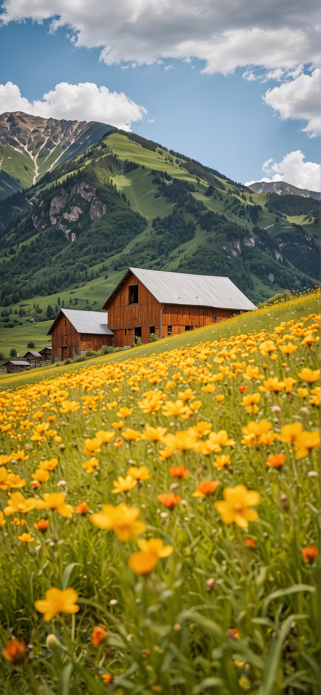 一张风景如画的风景照片,前景是一片充满活力的黄色花朵。两个传统的木谷仓,以其特有的红褐色,在郁郁葱葱的绿色山坡的背景下脱颖而出。谷仓坐落在稍微上坡的地方,土地向观众缓慢地向下倾斜。巍峨的山峦,部分笼罩在阴影中,部分沐浴在阳光中,在白云点缀的天空下,巍峨地矗立在远处。整体构图唤起了一种宁静和乡村魅力的感觉,具有田园诗般的乡村环境的特点。