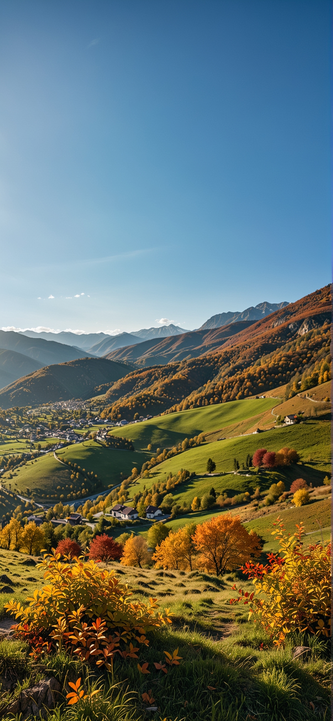 秋日俯瞰山谷风光:斑斓田野与远山相映小村居