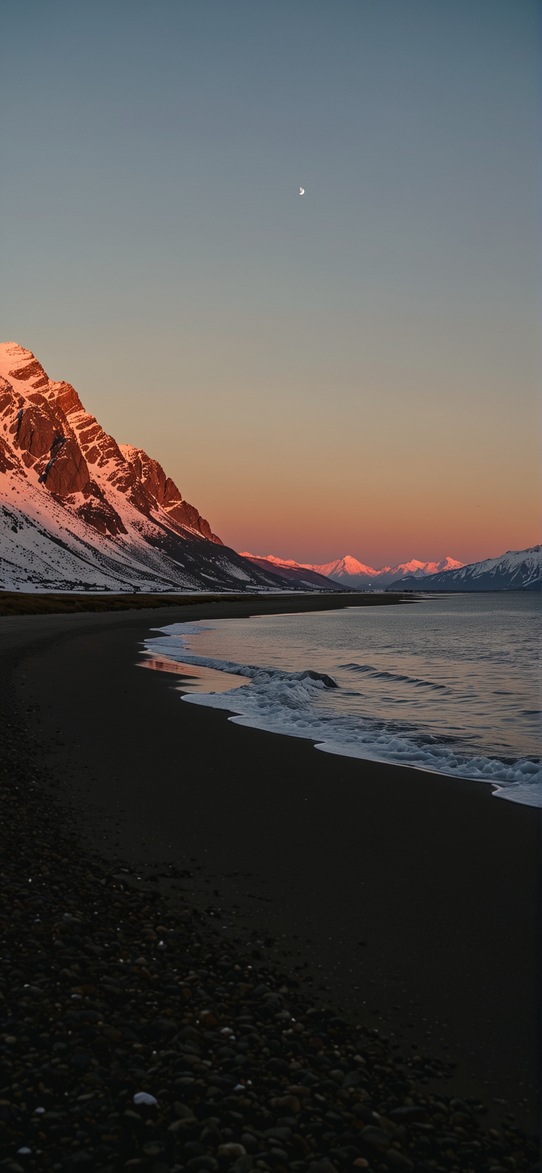 这张照片拍摄的是一个充满戏剧性的、多山的海岸线,沐浴在黄昏柔和的光线中。这张照片是从一个卵石沙滩的低视角拍摄的,从水面望向白雪覆盖的山峰。一个温柔的波浪打破了海岸,它的边缘被夕阳的温暖色调照亮。上面的天空是深蓝色的,在右上角可以看到新月的一小片。图像的整体色调是宁静祥和的,捕捉到了自然在白天和黑夜之间的过渡之美。