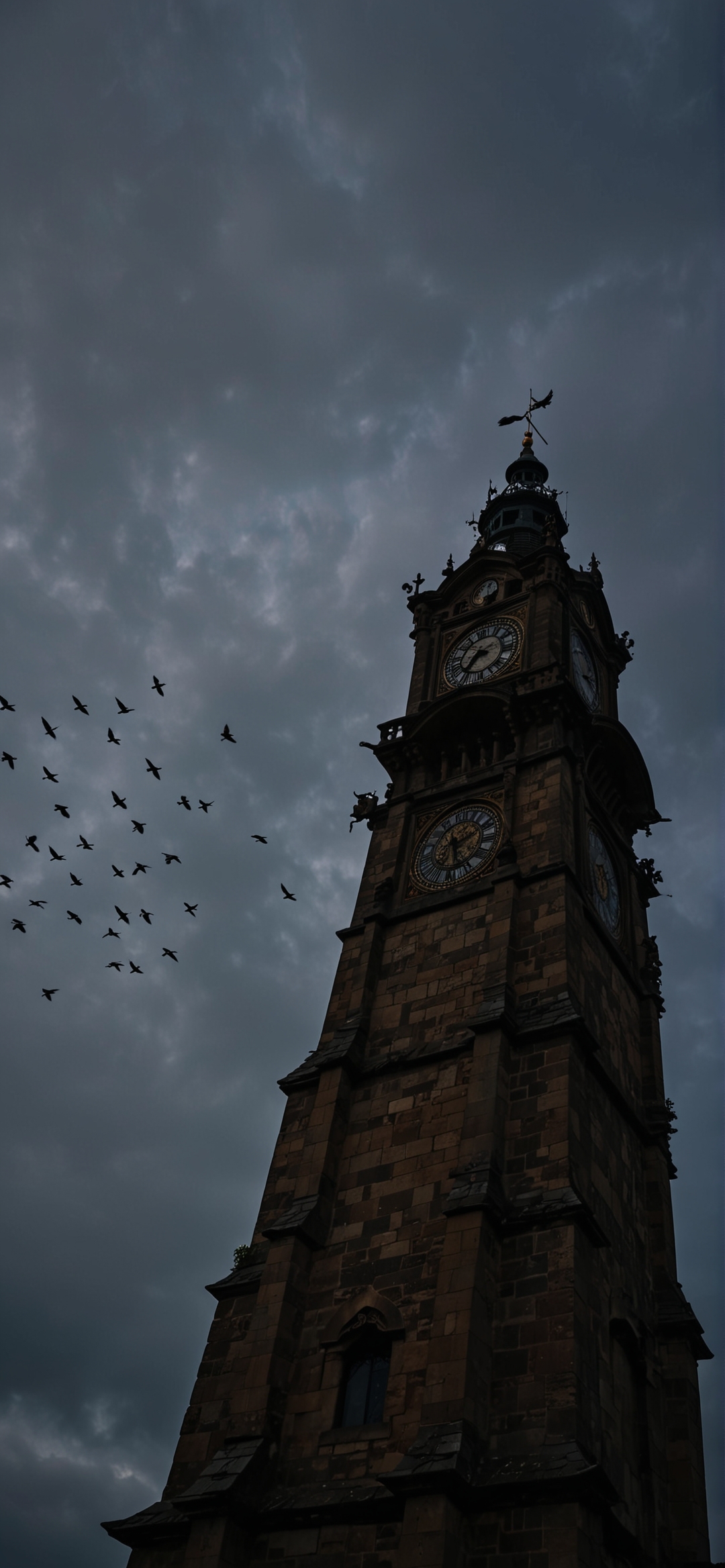 一座高大雄伟的钟楼映衬着充满云彩的天空。塔楼由深褐色的石头建造,从低角度拍摄,强调其高度。一群鸟的剪影编队飞向左边,增加了动态构图。这张照片散发出一种阴郁,几乎不祥的情绪,由于暗色调,低光,和坚实的塔和上面旋转的云之间的对比。
