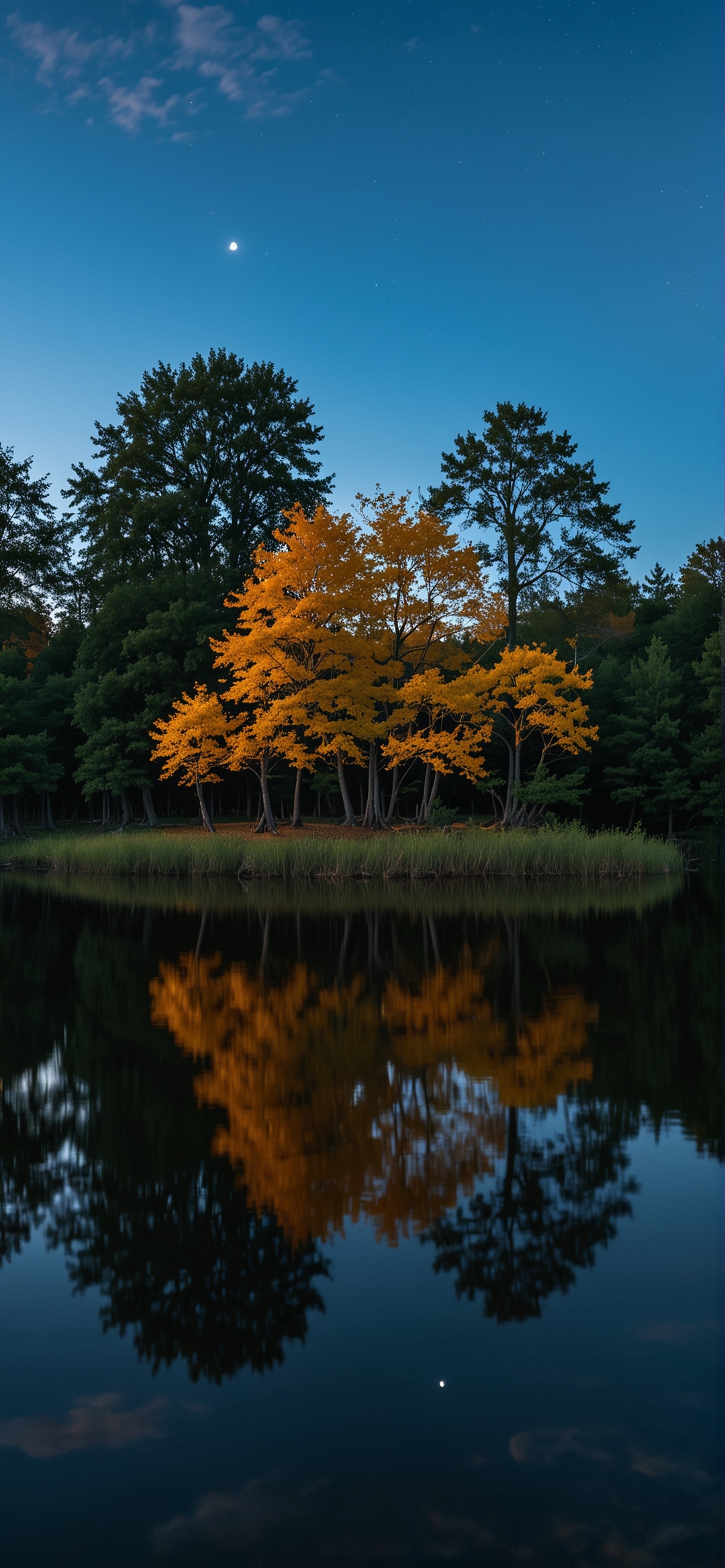 宁静的秋景倒映在平静的湖面上。在远处岸边深绿色的树林的映衬下,一小片金黄色树叶的树林显得格外醒目。前景中的水几乎是完全静止的,创造了一个像镜子一样的树木和天空的倒影。天空是深蓝色的,有一轮新月和几颗微弱的星星可见。整体气氛是和平与安宁的。