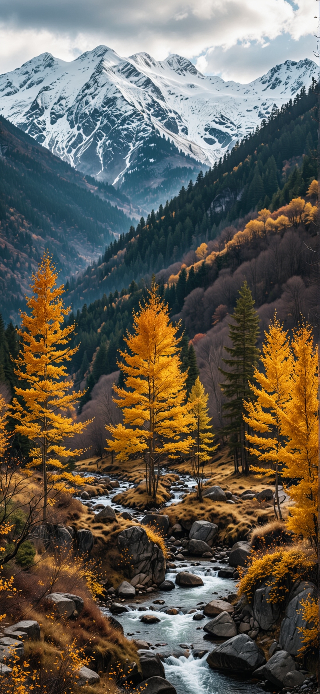 秋天,美丽山谷的照片。前景中,一条原始的河流从岩石上奔流而过,河岸上显眼地矗立着几棵金叶树。山谷两侧的山坡上都是茂密的森林,呈现出常绿和秋天的混合色彩。高耸的雪山构成了这一场景的雄伟背景,它们的山峰部分被云所笼罩。这幅图像唤起了一种宁静的感觉,以及大自然季节变化的令人敬畏的美。