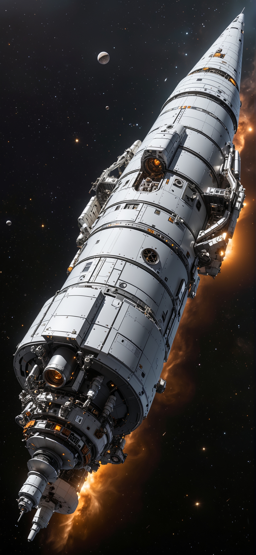 在深空的背景下,一艘光滑的、未来主义的宇宙飞船的渲染图像。这艘船有一个长长的圆柱形设计,有许多复杂的细节,包括发光的发动机、对接端口和一个尖鼻锥。该船以对角线为导向,提供了一个强调其长度和复杂工程的视角。它的白色外壳反射了远处恒星和附近星云的环境光,星云发出鲜艳的橙色。这一场景唤起了人们对太空旅行和先进技术的无限向往。